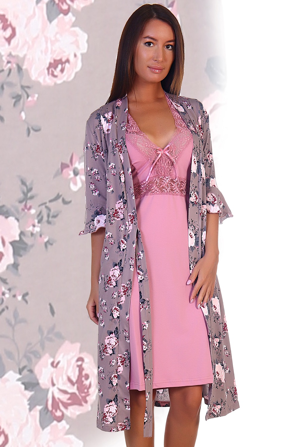 Пеньюар женский из кулирки, халат + сорочка. Запашной халат с рукавами до локтей, дизайн в виде цветов, длина чуть ниже коленей. Сорочка без рукавов, кружевная отделка и вставки, длина чуть выше коленей. Две расцветки розовая и кофейная. Размеры от 46 до 60. Цвет: розовый; Материал: кулирка;кулирка; Состав: 100% хлопок.