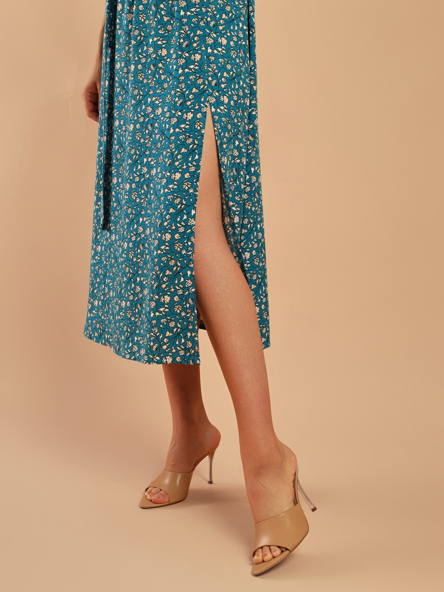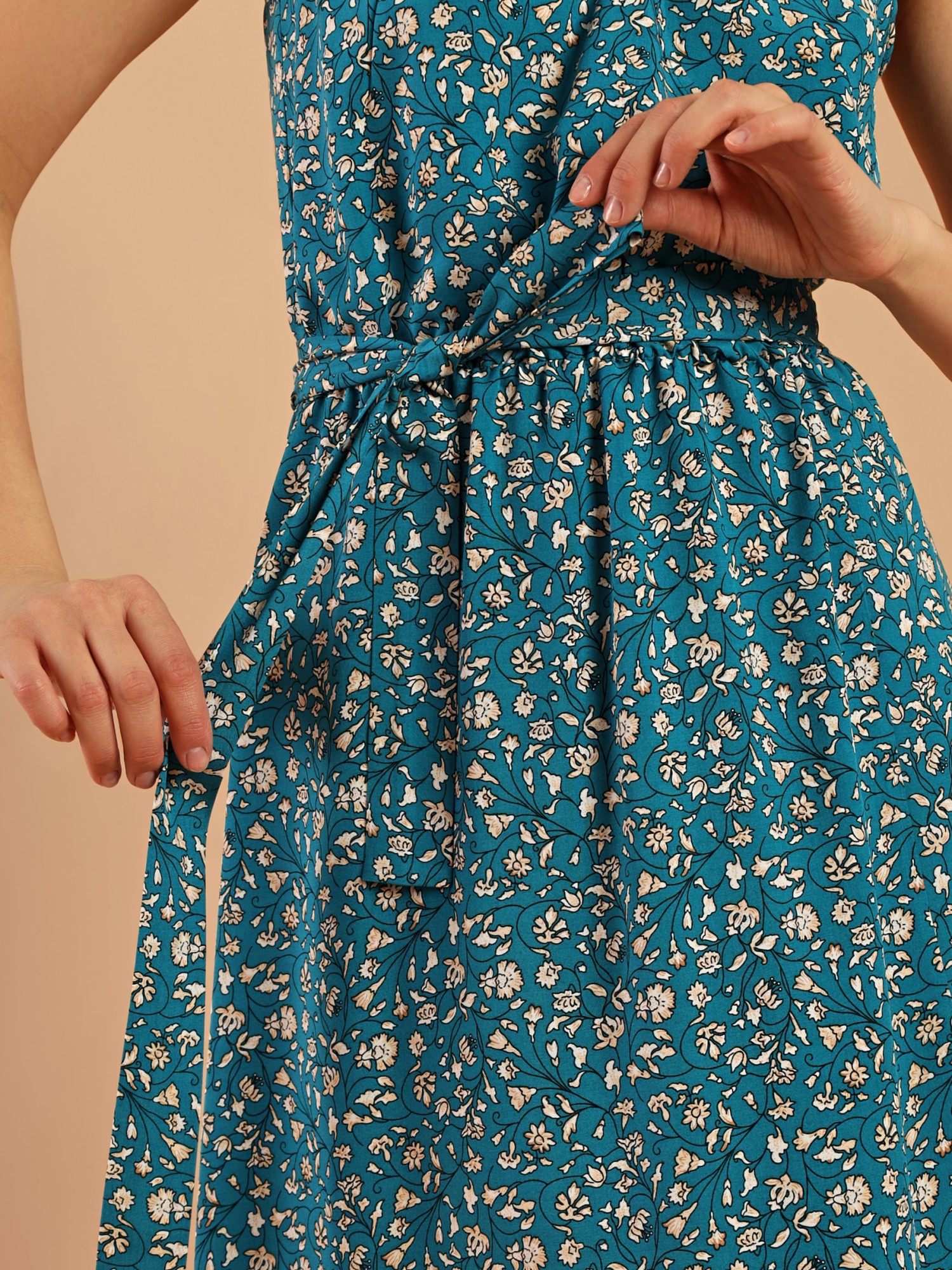 Сарафан молодежный из тканого полотна «штапель» с набивным рисунком, с углубленной V-образной горловиной, на узких бретелях, отрезное по линии талии, с расклешенной юбкой, собранной с помощью эластичной тесьмы. Горловина и проймы окантованы основным материалом. Переднее полотнище юбки из двух частей, в соединительном шве выполнен разрез. Изделие комплектуется съемным поясом, завязывающимся на талии.