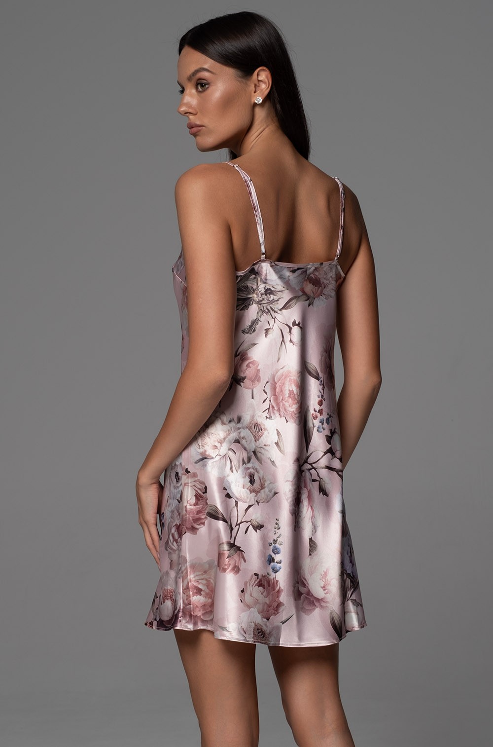 Короткая сорочка Mia-Amore на тонких бретелях из смесового шелкового полотна с изящным принтом, верх декольте декорирован кружевом. Сорочка украшена подвеской.