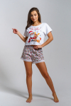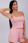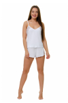 Пижама состоит из майки и шорт. Майка с отрезным лифом, украшенным кружевом. Шорты украшены кружевом по низу.