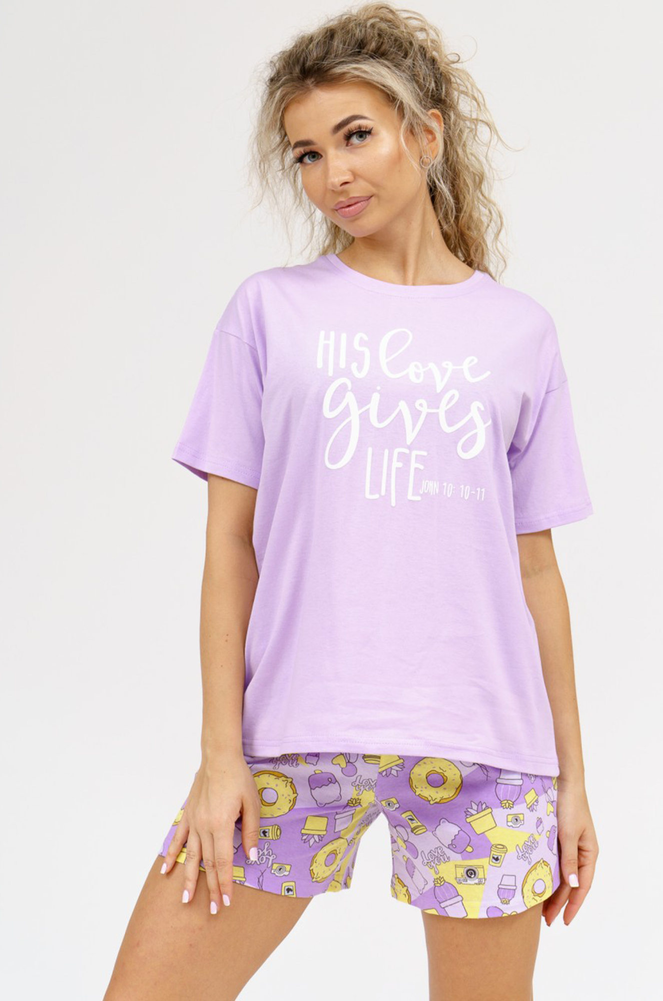 Удобная симпатичная хлопковая пижамка. Футболка однотонная, прямого кроя, на полочке печатный принт. Шорты с набивным рисунком, с боковыми карманами, пояс на широкой резинке. Такой комплект подойдёт и для сна, и для домашнего отдыха. Ткань кулирка.