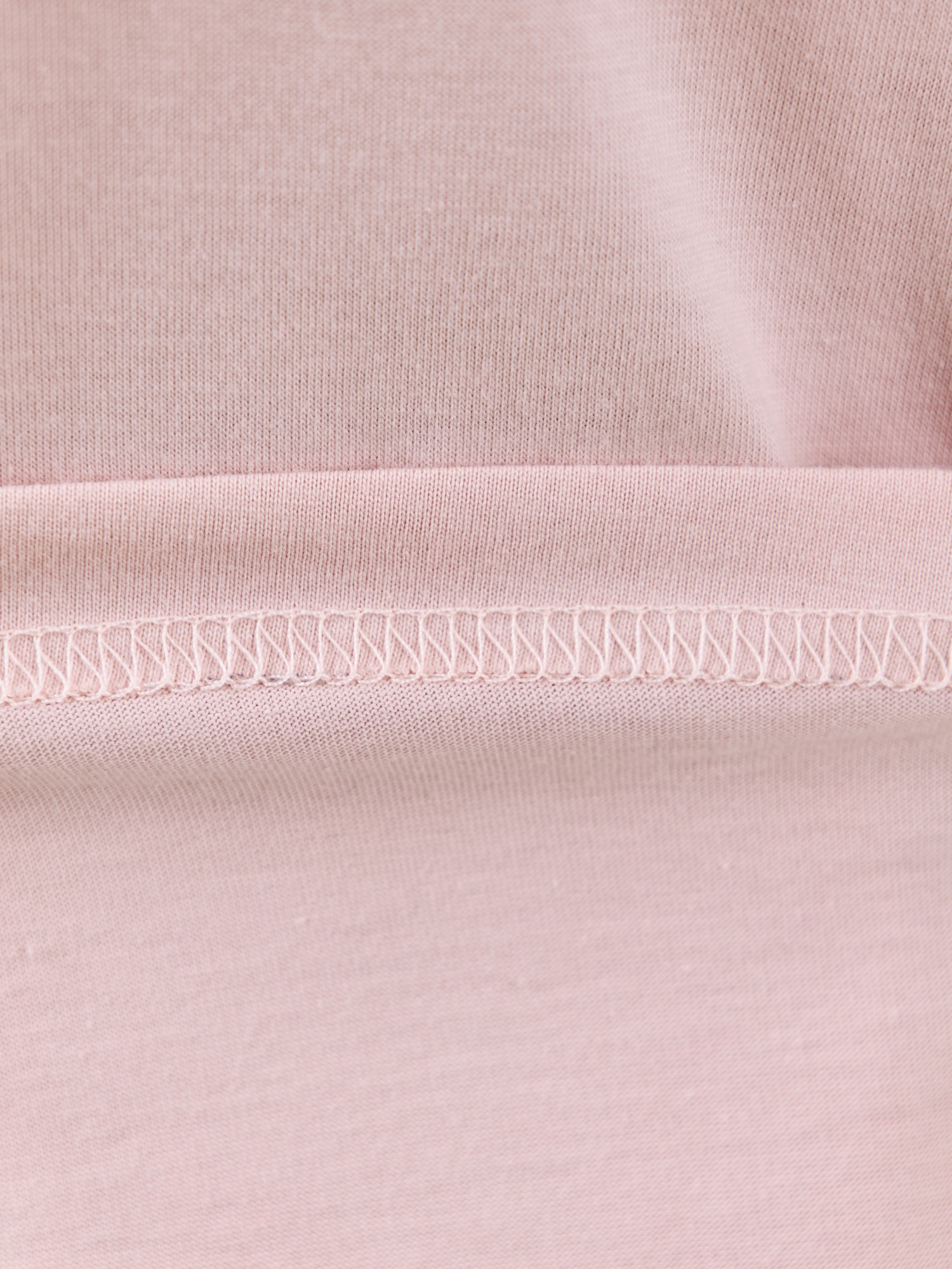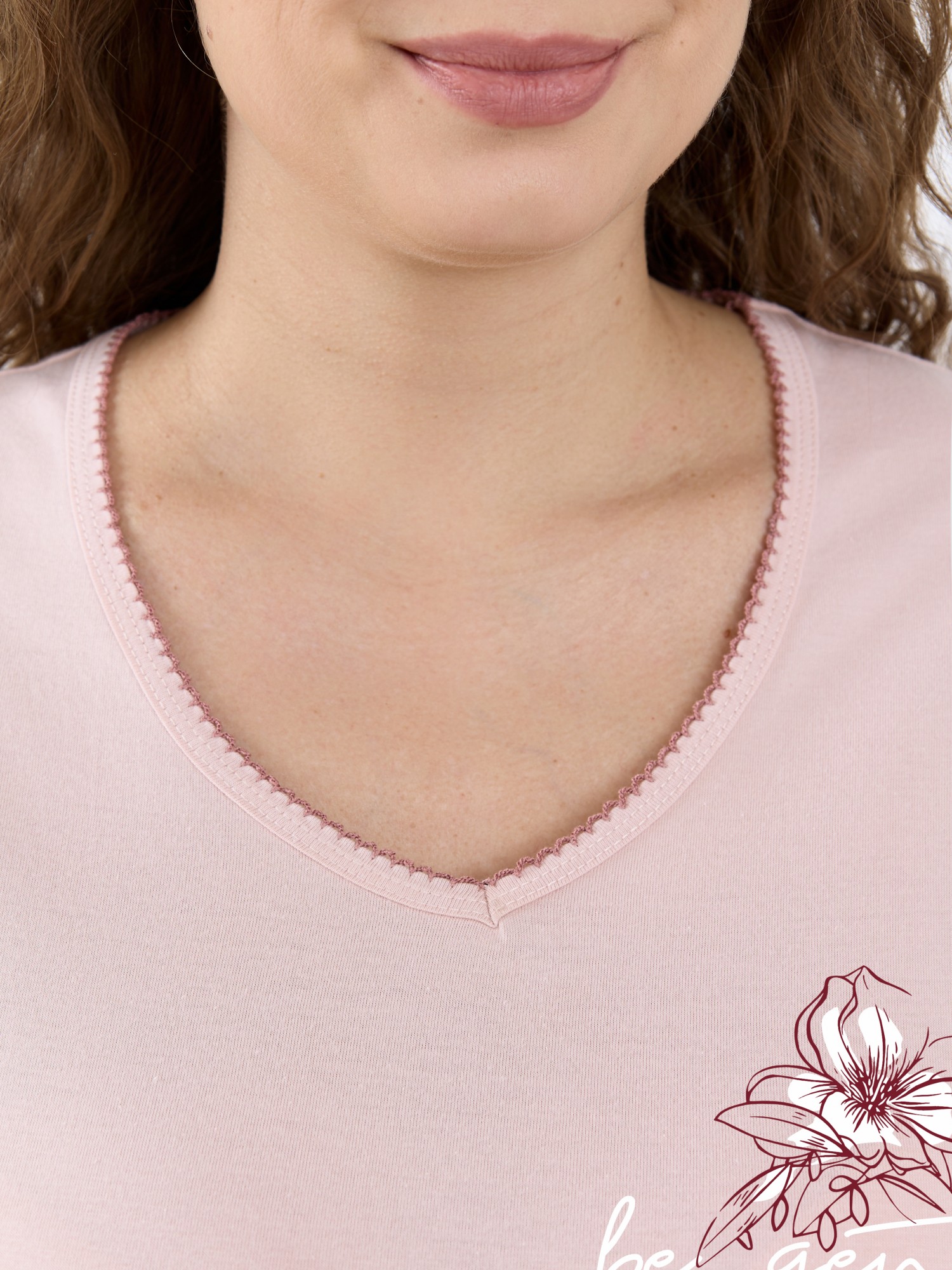 Пижама женская из трикотажного полотна «кулирка» в комбинации двух видов: гладкокрашеного и с набивным рисунком, состоящая из футболки и шорт. Футболка – из гладкокрашеного полотна, с короткими цельнокроеными рукавами, горловиной V-образной формы. Низ рукавов и горловина обработаны декоративной строчкой «кроше», на полочке печать, выполненная в технике «шелкографии».Шорты – из полотна с набивным рисунком, удлиненные, свободного покроя, с эластичной тесьмой по талии.