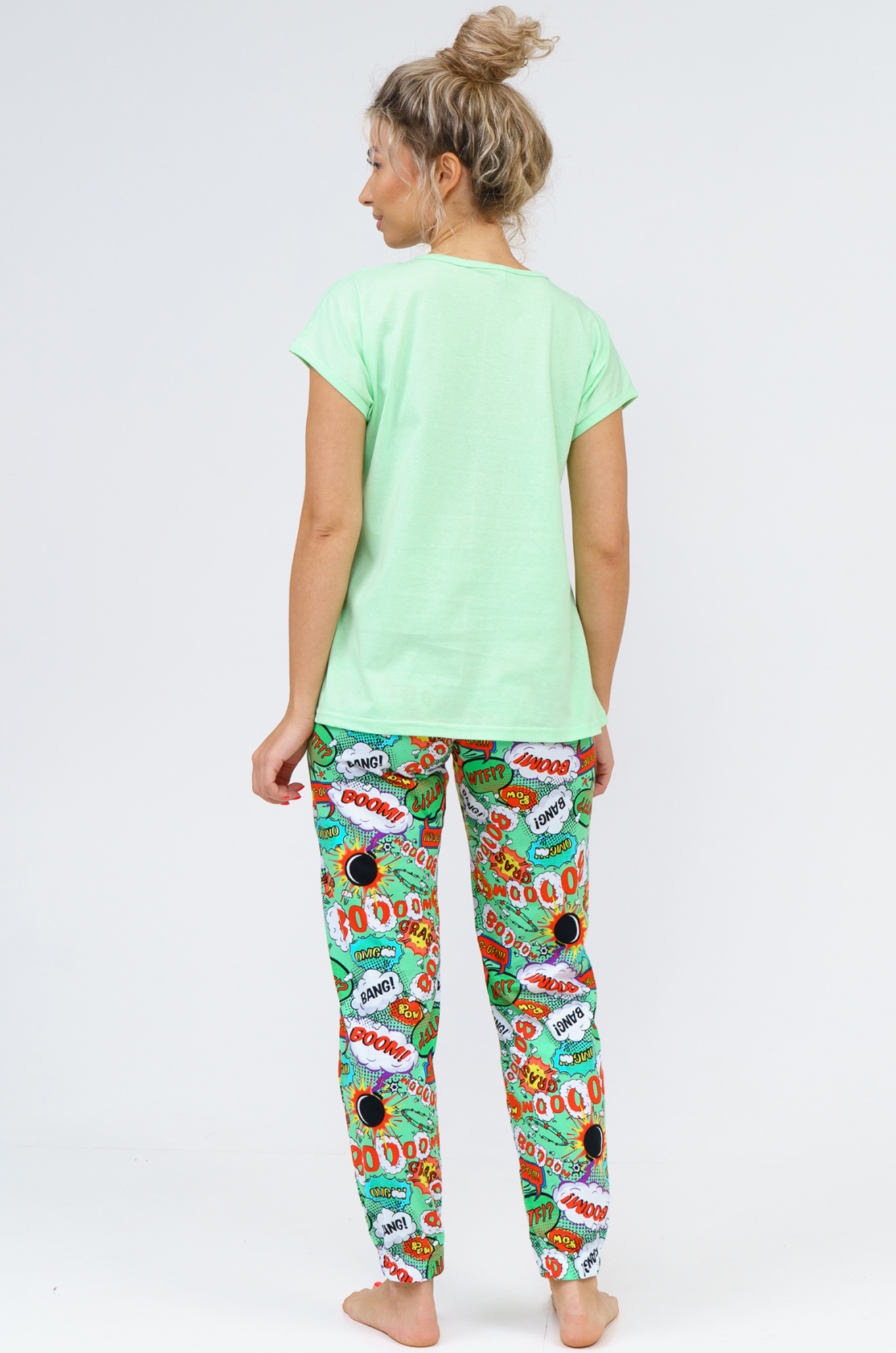 Футболка прилегающего силуэта с цельнокроеными рукавами, с печатным принтом на полочке. Брюки с внутренними карманами, внизу на резинке.