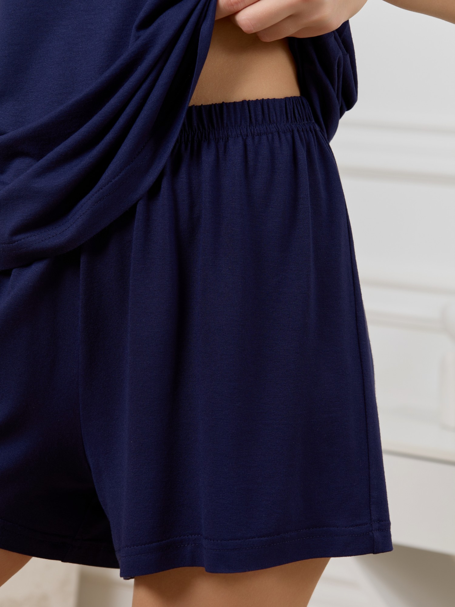Пижама молодежная гладкокрашеного трикотажного вискозного полотна с отделкой кружевом, состоящая из топа и шорт. Топ - на узких бретелях, слегка расширенный книзу. V-образная горловина полочки и спинки отделана кружевными вставками треугольной формы. Проймы окантованы основным материалом. Шорты – свободные, средней длины, с эластичной тесьмой по талии.