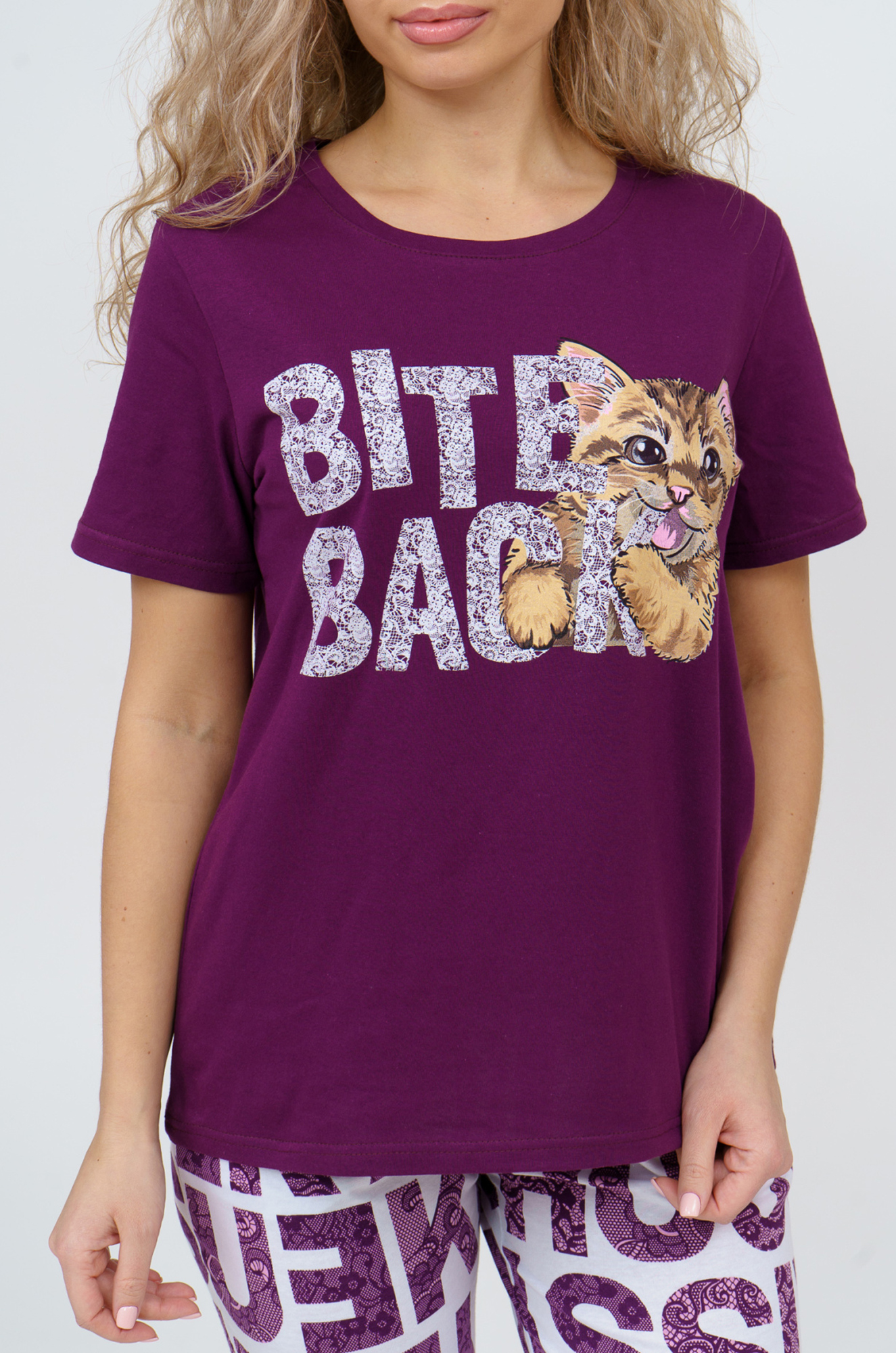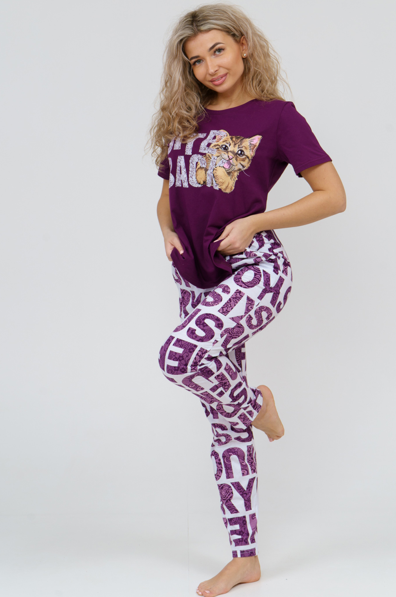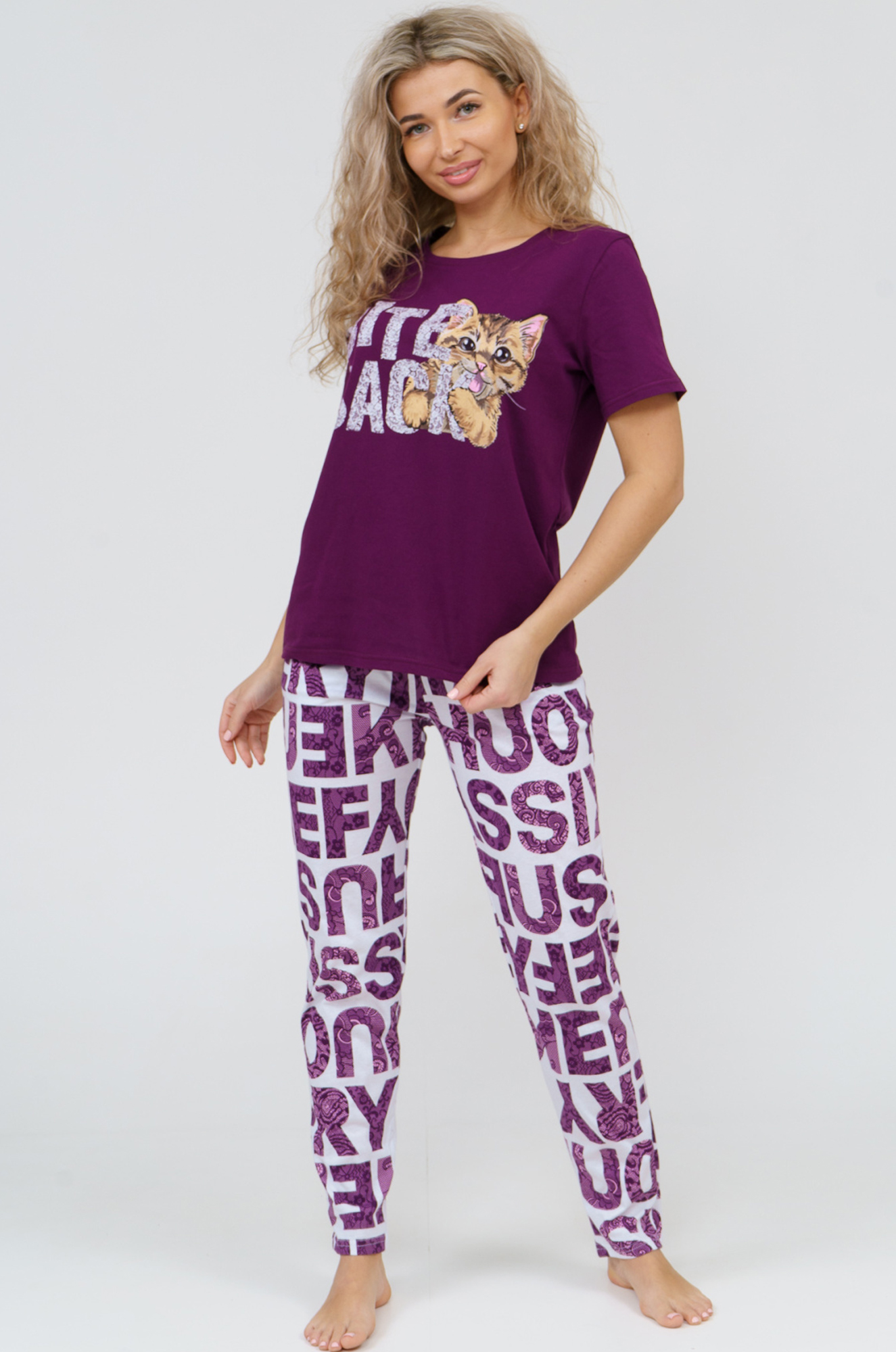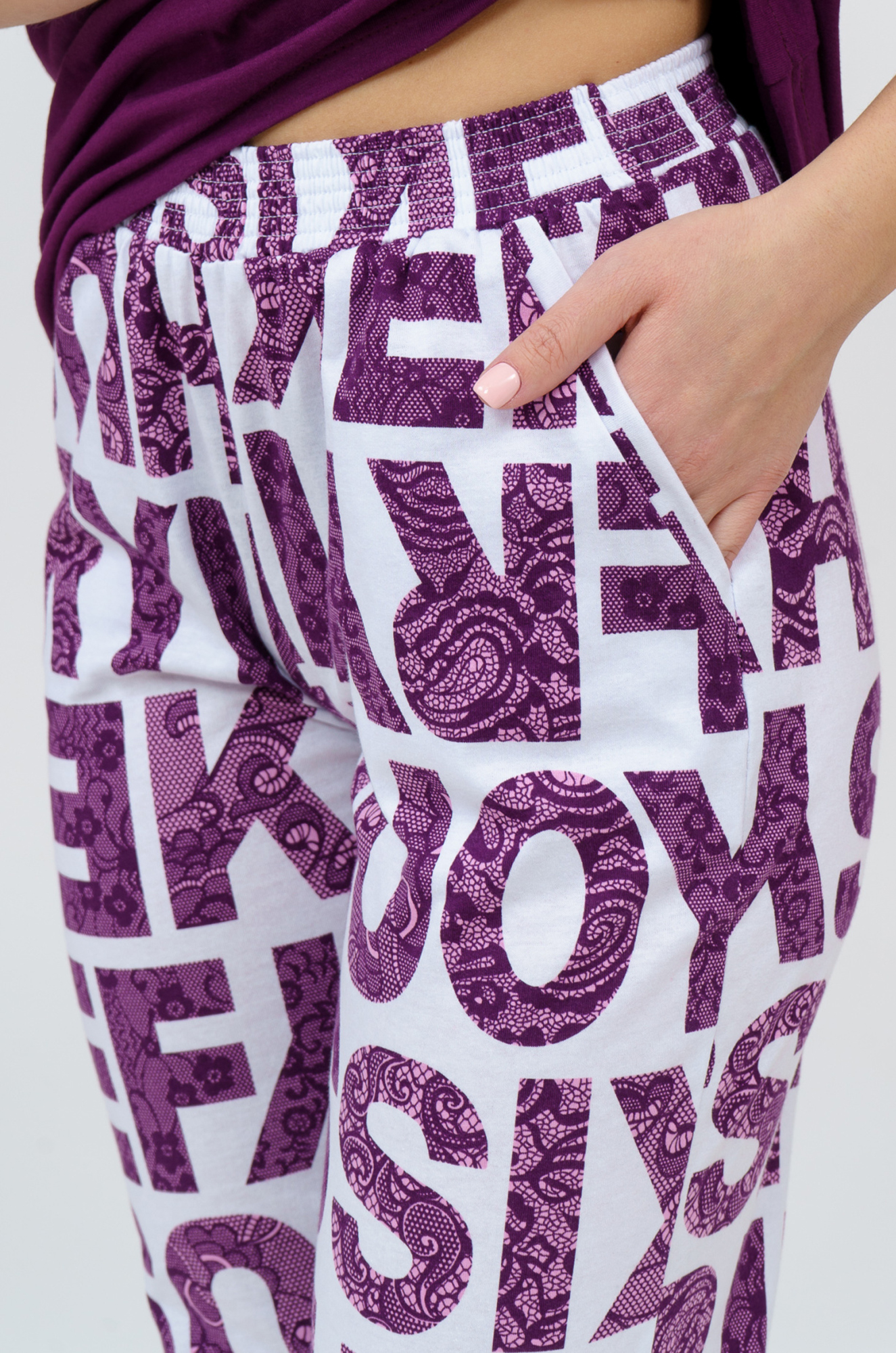 Пижамка с футболкой и брюками. Футболка прилегающего силуэта со спущенным плечом и коротким рукавом, на полочке печатный принт. Брюки прямые, чуть заужены к низу, пояс на резинке, внутренние карманы.