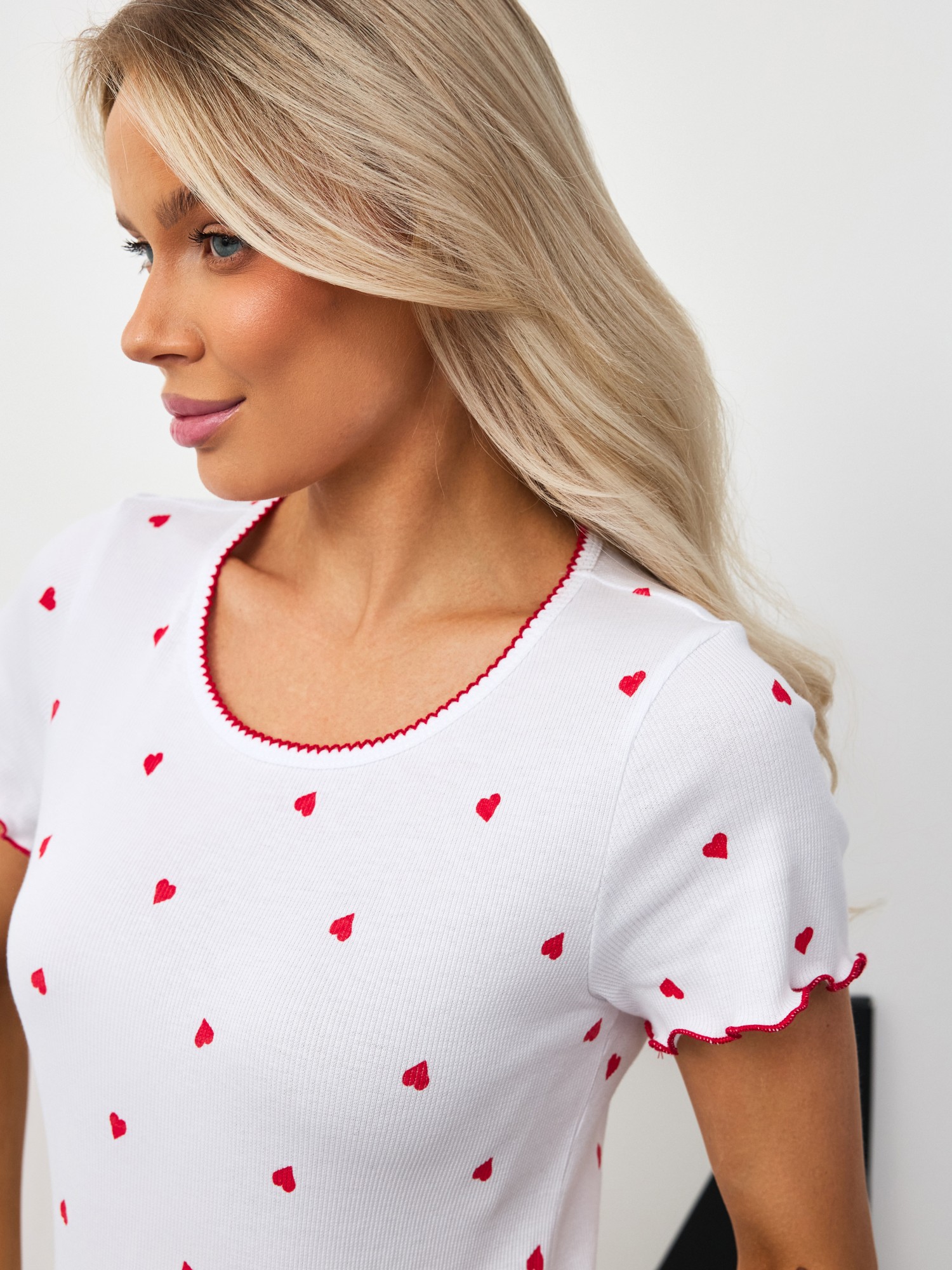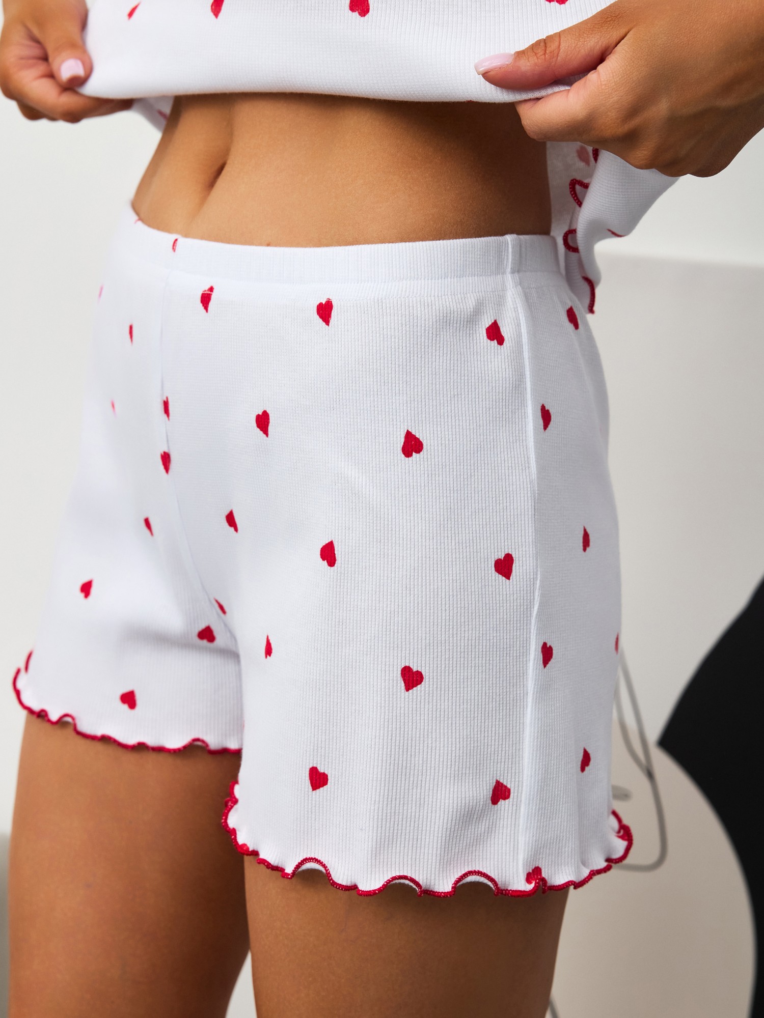 Пижама молодежная из трикотажного полотна «кашкорсе» с набивным рисунком состоящая из майки-топа и шорт. Футболка – полуприлегающего силуэта, с короткими втачными рукавами, горловиной овальной формы, окантованной основным материалом. По горловине выполнена декоративная строчка «кроше» контрастными нитками. Нижний срез рукавов и низ изделия обработаны узкой обметочной, создающей красивый волнистый край.Шорты - укороченные, расширенные книзу, с эластичной тесьмой по талии. Нижние срезы шорт обработаны узкой обметочной строчкой контрастного цвета, создающей красивый волнистый край.