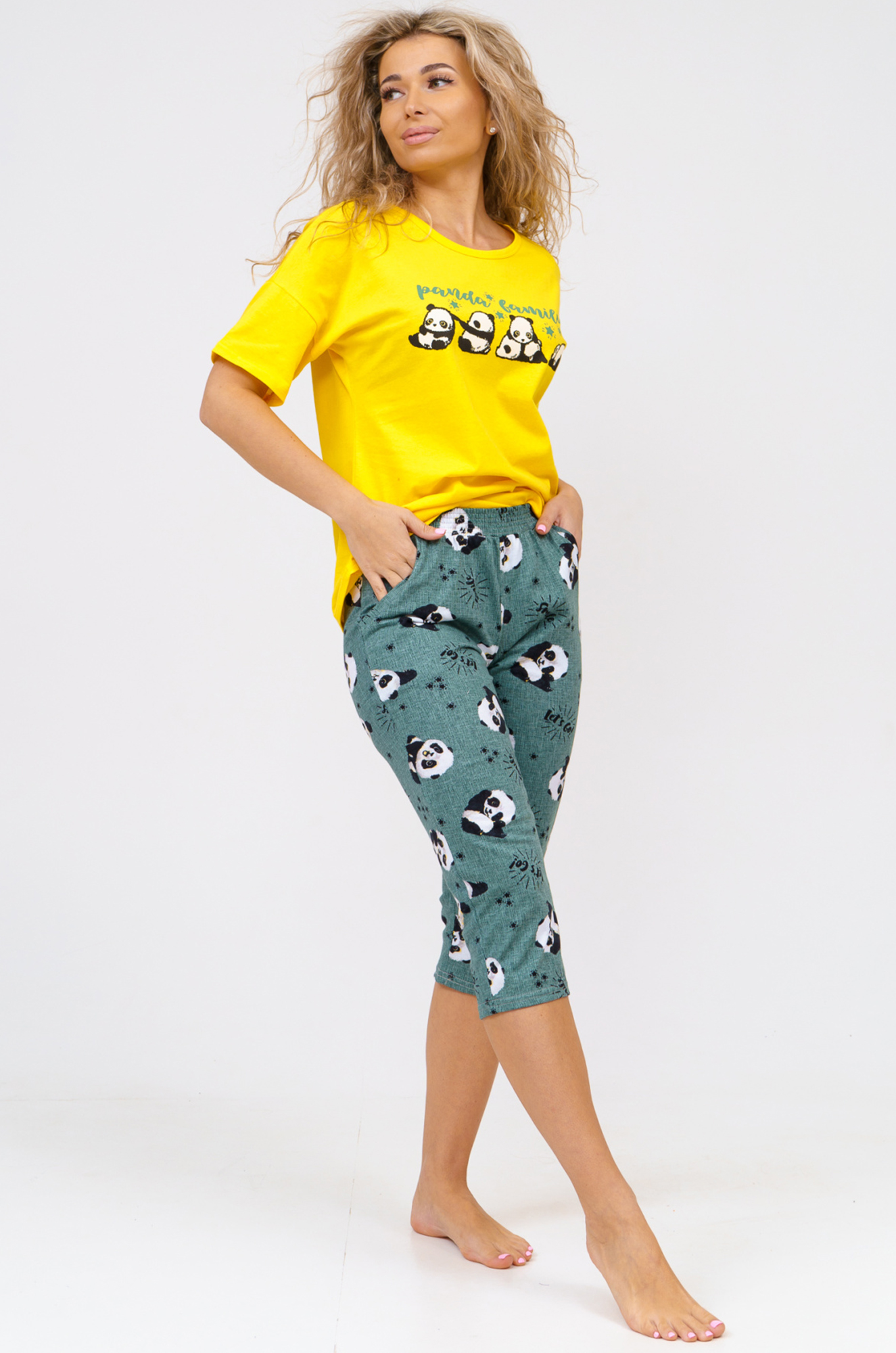 Очаровательная хлопковая пижама из кулирного полотна. Яркая футболка с печатью, повторяющей принт на бриджах. Бриджи с карманми, длина чуть ниже колен.