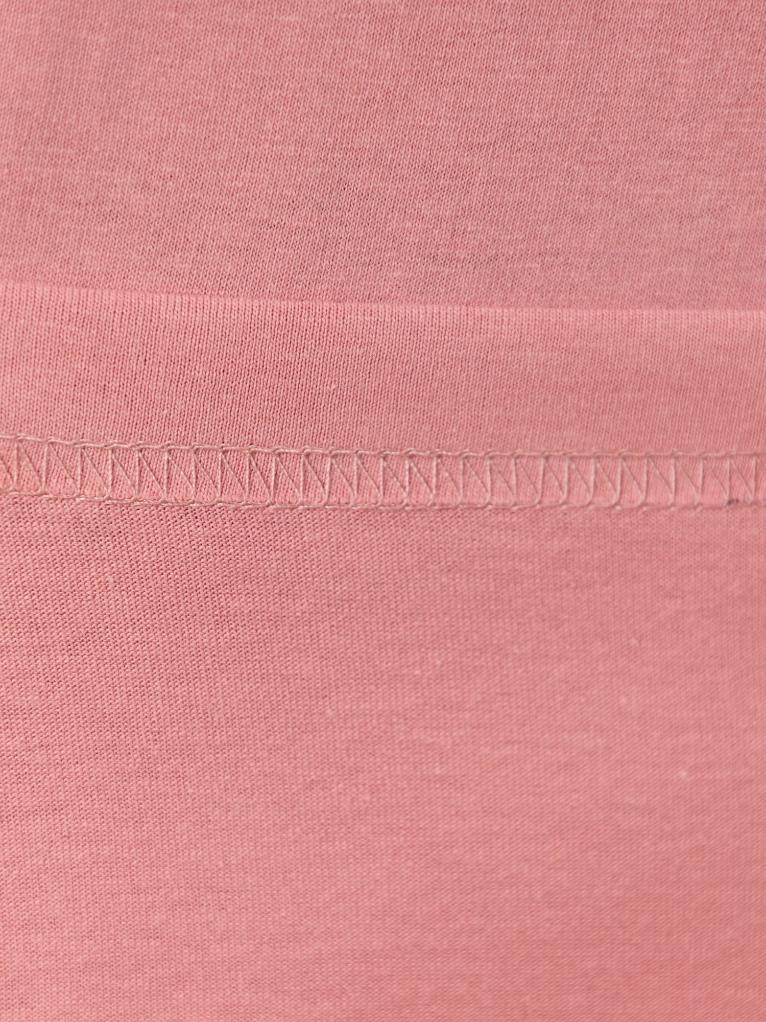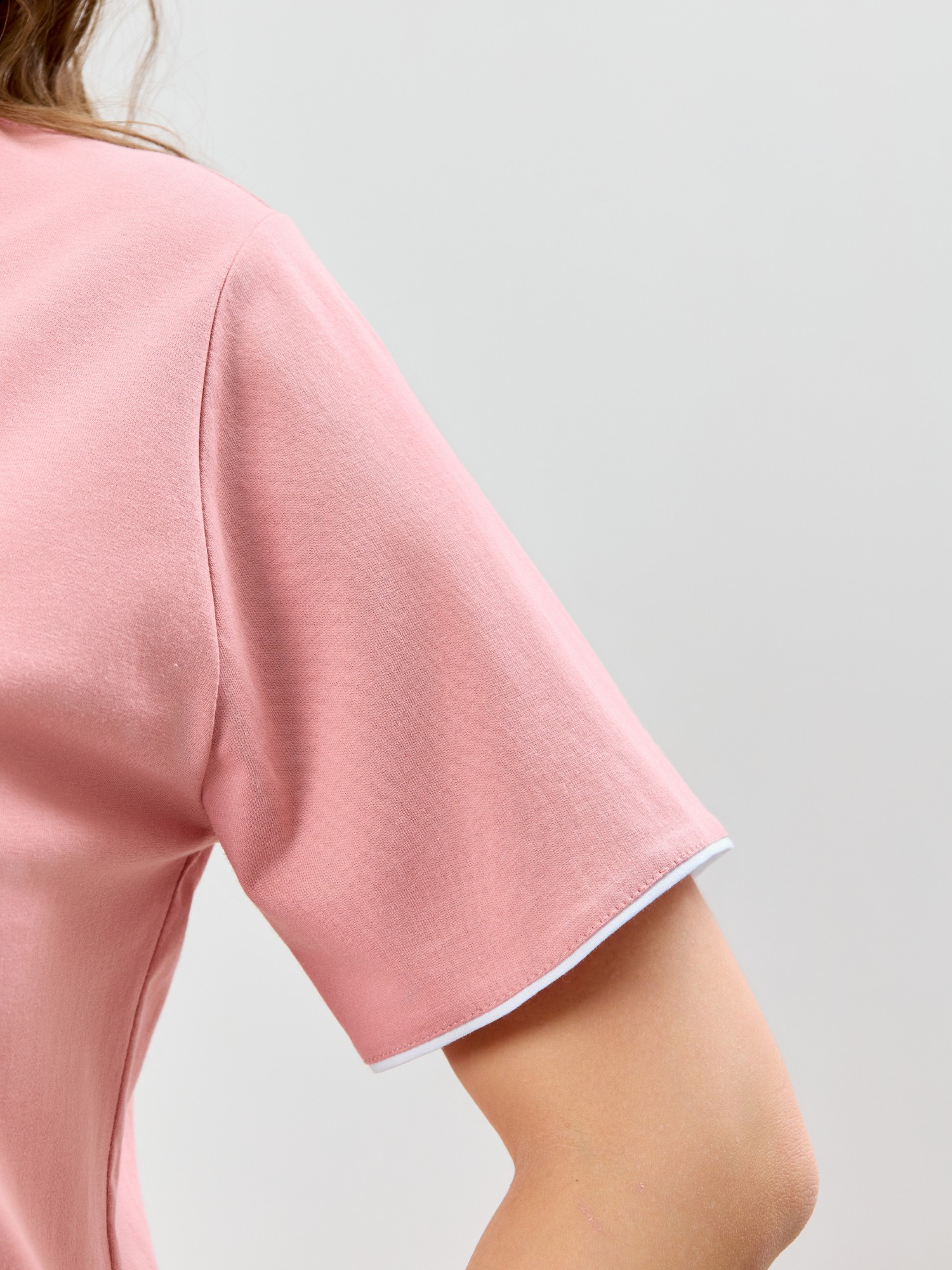 Пижама женская из трикотажного полотна «кулирка» в комбинации двух видов полотен: с набивным рисунком и гладкокрашенного в единой цветовой гамме, состоящая из футболки и брюк. Футболка - из гладкокрашенного полотна, классического покроя, с короткими втачными рукавами, горловиной овальной формы и принтом на полочке, выполненным в технике «шелкографии». Горловина, низ рукавов обработаны узким притачным кантом контрастного цвета.Брюки - длинные, с эластичной тесьмой по талии и притачными манжетами, которые обработаны с узким кантом контрастного цвета в соединительных швах.