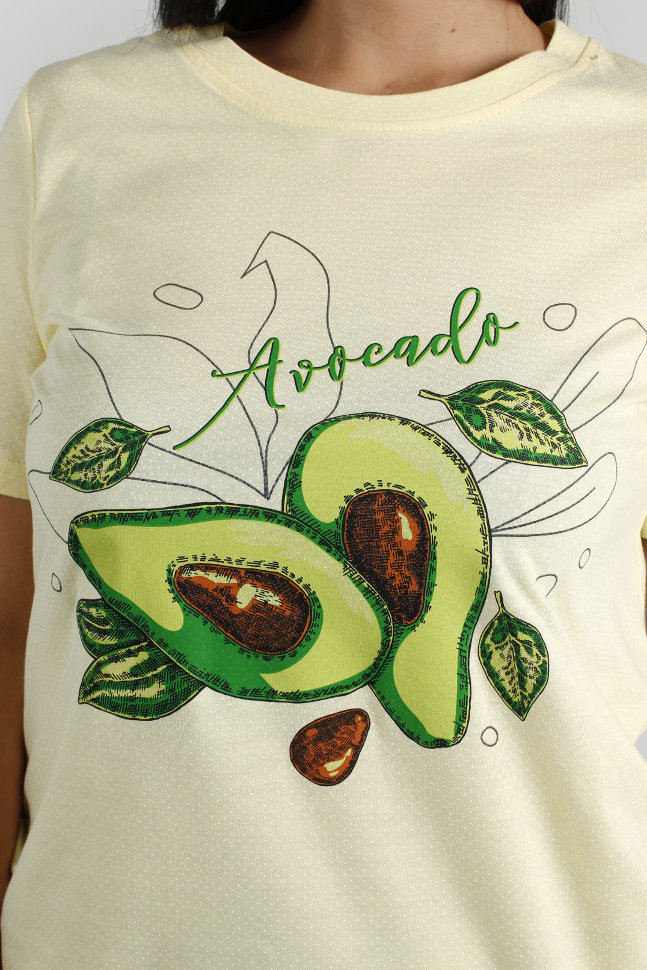 Пижама женская с шортами из набивного кулирного полотна, на полочке верха изделия тропический принт "Авокадо". Состав: кулирное полотно 100% хлопок. Размеры:50,52