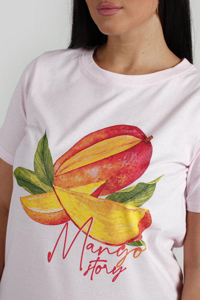 Пижама женская с шортами из набивного кулирного полотна, розовый верх изделия с тропическим принтом "Манго". Состав: кулирное полотно 100% хлопок. Размеры 46-60
