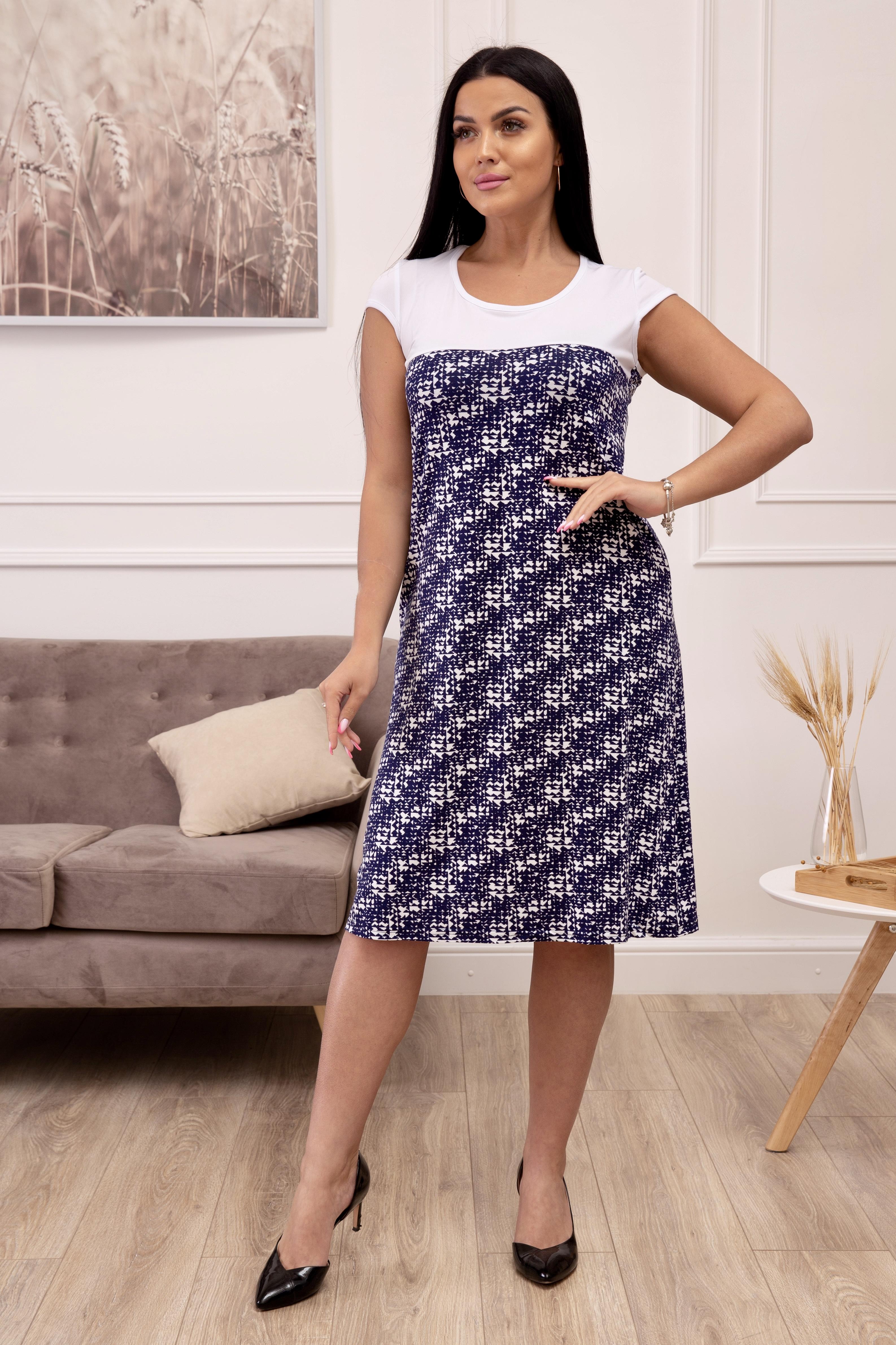 Лёгкое, красивое платье прямого силуэта с коротким втачным рукавом. Кокетка отрезная над грудью, выполнена в белом цвете и с круглым вырезом горловины. Основная часть платья с текстурным рисунком в чёрных и белых тонах. Отличное платье для летних прогулок.