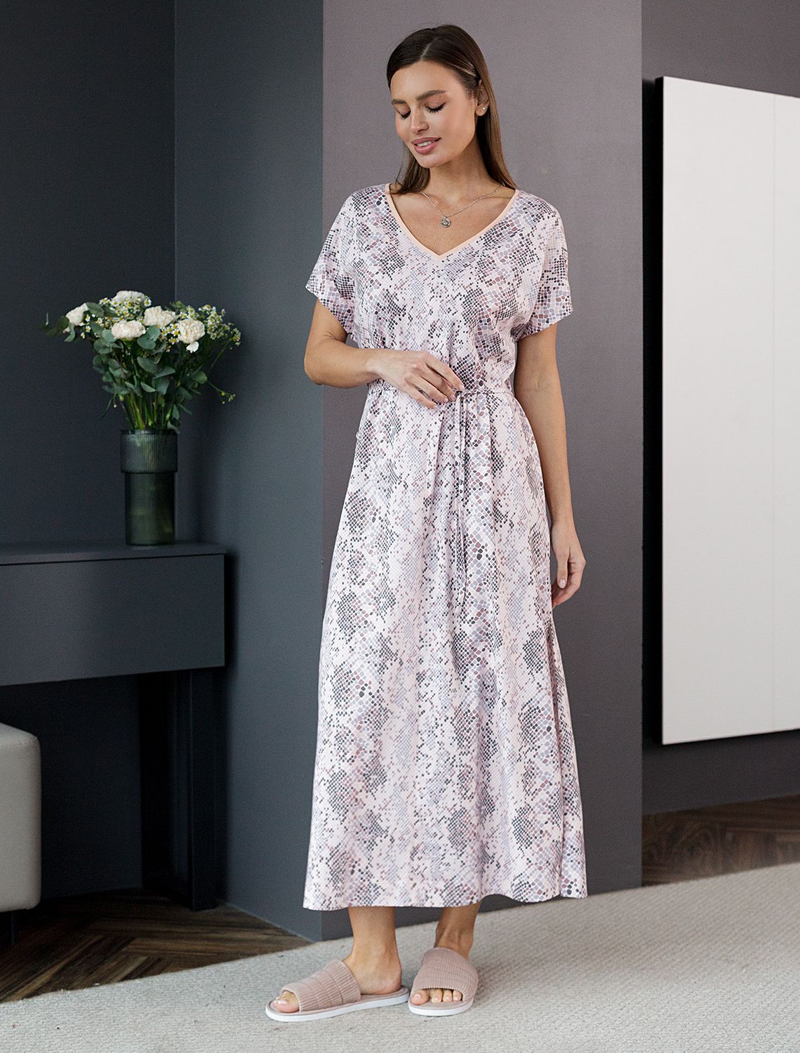 Легкое платье не только практично для отдыха, но и подойдет для домашнего использования благодаря натуральному хлопку, который бережет кожу и поддерживает оптимальный микроклимат тела. Его благородный цвет гармонично сочетается с разными аксессуарами, помогая создавать как повседневные, так и более нарядные образы. Отсутствие сложных деталей делает это повседневное платье удобным для тех, кто ценит простоту и стиль одновременно. Будьте шикарной женщиной в этом красивом платье даже дома. кофейно-пудровый питон