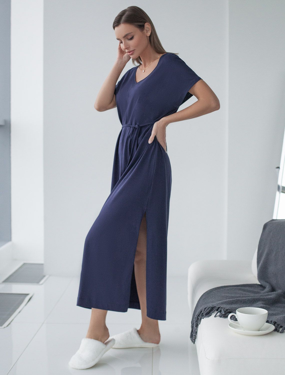 Легкое платье не только практично для отдыха, но и подойдет для домашнего использования благодаря натуральному хлопку, который бережет кожу и поддерживает оптимальный микроклимат тела. Его благородный цвет гармонично сочетается с разными аксессуарами, помогая создавать как повседневные, так и более нарядные образы. Отсутствие сложных деталей делает это повседневное платье удобным для тех, кто ценит простоту и стиль одновременно. Будьте шикарной женщиной в этом красивом платье даже дома. т.синий