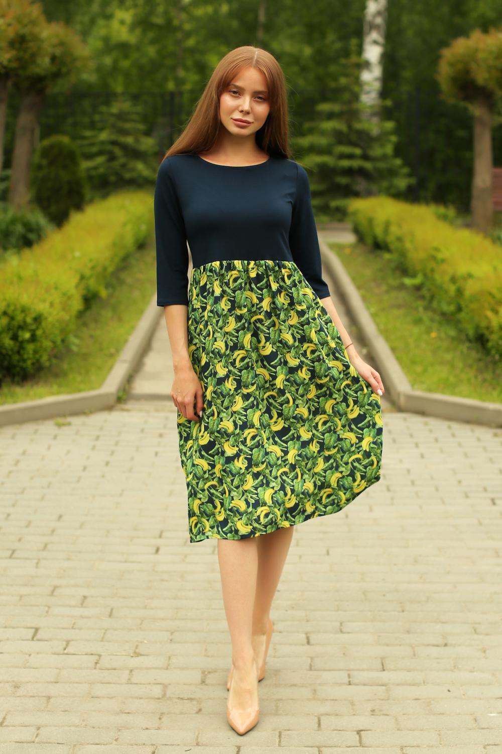 Необыкновенно красивое и весёлое платье Тропиканка. Отрезной однотонный верх и юбка с цветным  рисунком в виде бананов. Длина юбки ниже колена, рукав укорочен. Подойдёт как для прогулки на улице или похода в кино.