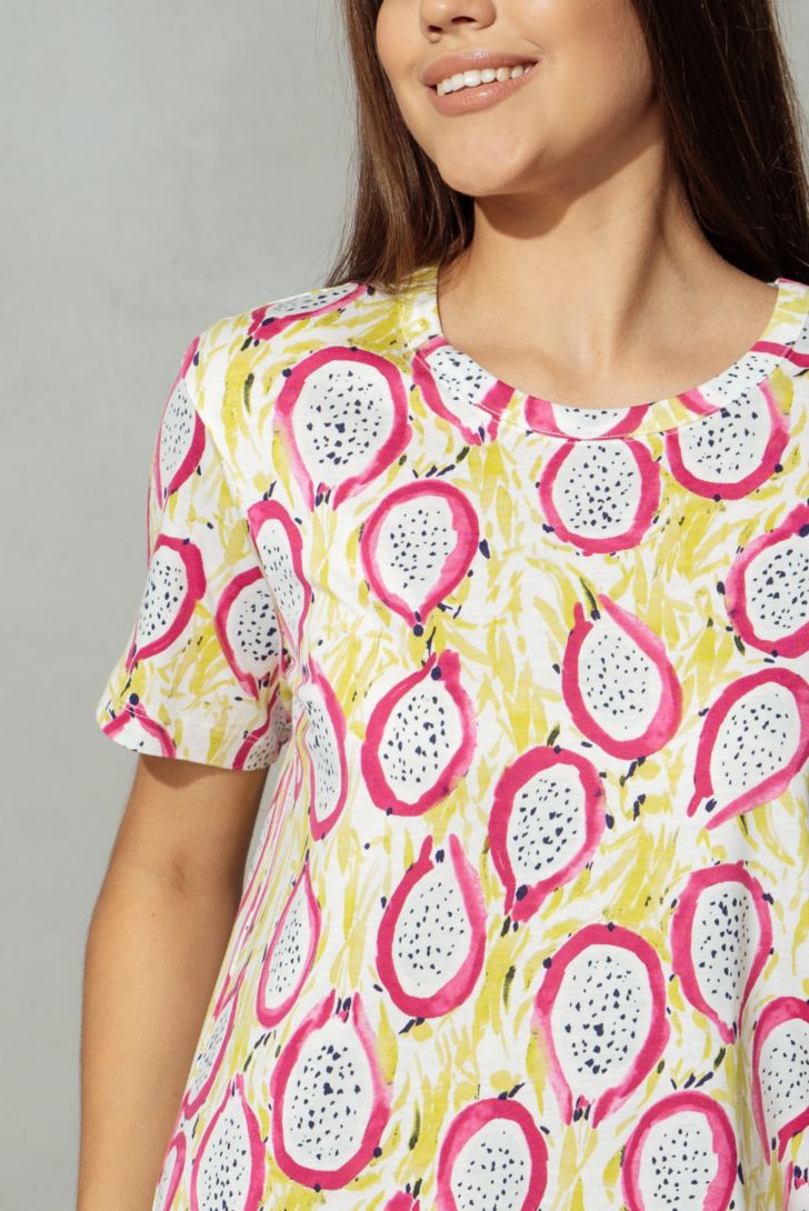 Домашнее платье – футболка с круглым вырезом горловины. Платье свободного силуэта с ассиментричным низом. Модель в однотонном исполнении декорирована тематическим принтом. По низу платья разрезы..