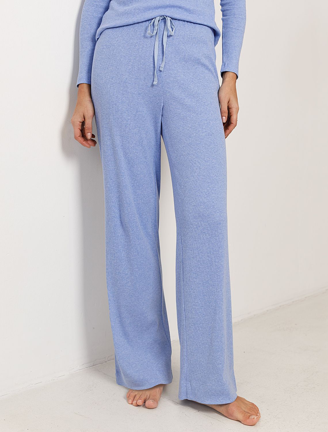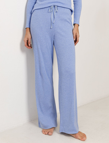 Прямые брюки голубого цвета с эффектом меланж с поясом на тонкой резинке из фактурного трикотажа в рубчик созданы для вашего ежедневного комфорта. Мягкий материал обеспечивает приятные ощущения к телу, а эластичные свойства ткани обеспечивают безупречную посадку на различные типы фигуры, в том числе и большие размеры. Такие домашние брюки отлично подойдут для отдыха дома благодаря свободному крою, облегчающему движения даже в течение длительного времени. Выбирая эти штаны, вы получаете удобство и стиль в одном решении, ведь домашние и повседневные задачи будут проходить с максимальным комфортом. Красивые брюки сохранят свой внешний вид даже при активной эксплуатации, ткань не теряет форму. Брюки подходят для создания уютного образа на каждый день, легко сочетаются с другими предметами гардероба для прогулок и уютных вечеров. Приятная рельефная фактура ткани и аккуратный дизайн создают баланс между стилем и удобством, что особенно важно при выборе повседневных брючек.
