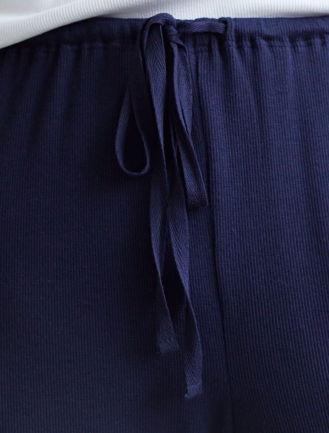 Прямые брюки темно-синего цвета с поясом на тонкой резинке из фактурного трикотажа в рубчик созданы для вашего ежедневного комфорта. Мягкий материал обеспечивает приятные ощущения к телу, а эластичные свойства ткани обеспечивают безупречную посадку на различные типы фигуры, в том числе и большие размеры. Такие домашние брюки отлично подойдут для отдыха дома благодаря свободному крою, облегчающему движения даже в течение длительного времени. Выбирая эти штаны, вы получаете удобство и стиль в одном решении, ведь домашние и повседневные задачи будут проходить с максимальным комфортом. Красивые брюки сохранят свой внешний вид даже при активной эксплуатации, ткань не теряет форму. Брюки подходят для создания уютного образа на каждый день, легко сочетаются с другими предметами гардероба для прогулок и уютных вечеров. Приятная рельефная фактура ткани и аккуратный дизайн создают баланс между стилем и удобством, что особенно важно при выборе повседневных брючек.