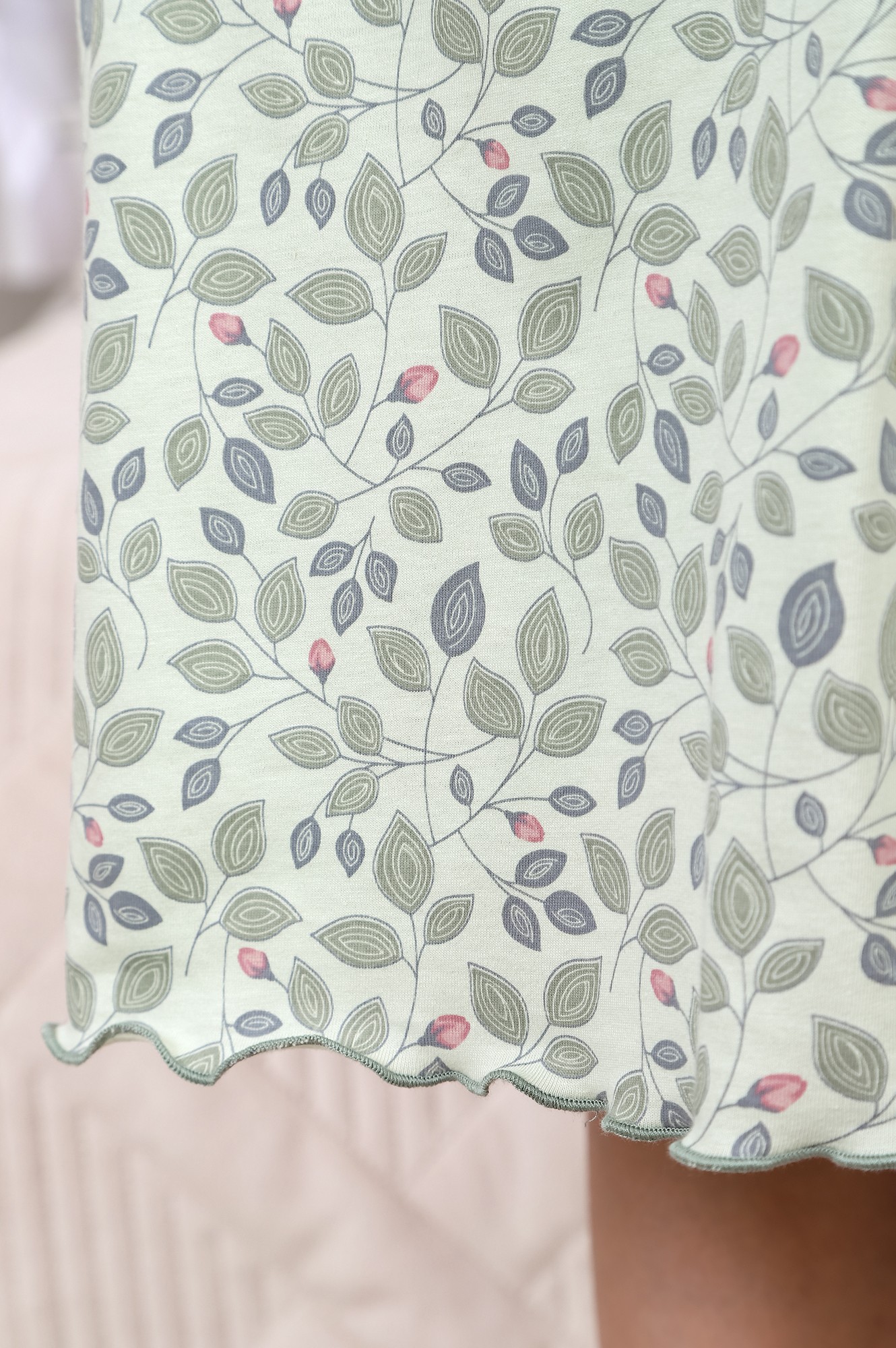 Сорочка женская из трикотажного полотна «кулирка» с набивным рисунком, расширенная книзу, без рукавов, с расширенной, углубленной горловиной овальной формы и притачной кокеткой по переду. Срезы пройм и горловины, а также шов притачивания кокетки, обработаны фасонной эластичной тесьмой с кружевным краем. Низ изделия обработан узкой обметочной строчкой.