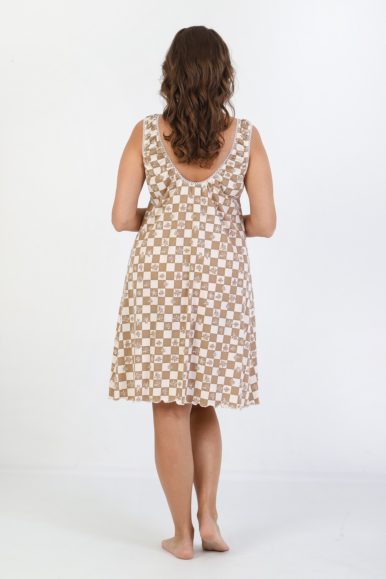 Сорочка женская из трикотажного полотна «кулирка» с набивным рисунком, расширенная книзу, без рукавов, с расширенной, углубленной горловиной овальной формы и притачной кокеткой по переду. Срезы пройм и горловины, а также шов притачивания кокетки, обработаны фасонной эластичной тесьмой с кружевным краем. Низ изделия обработан узкой обметочной строчкой.