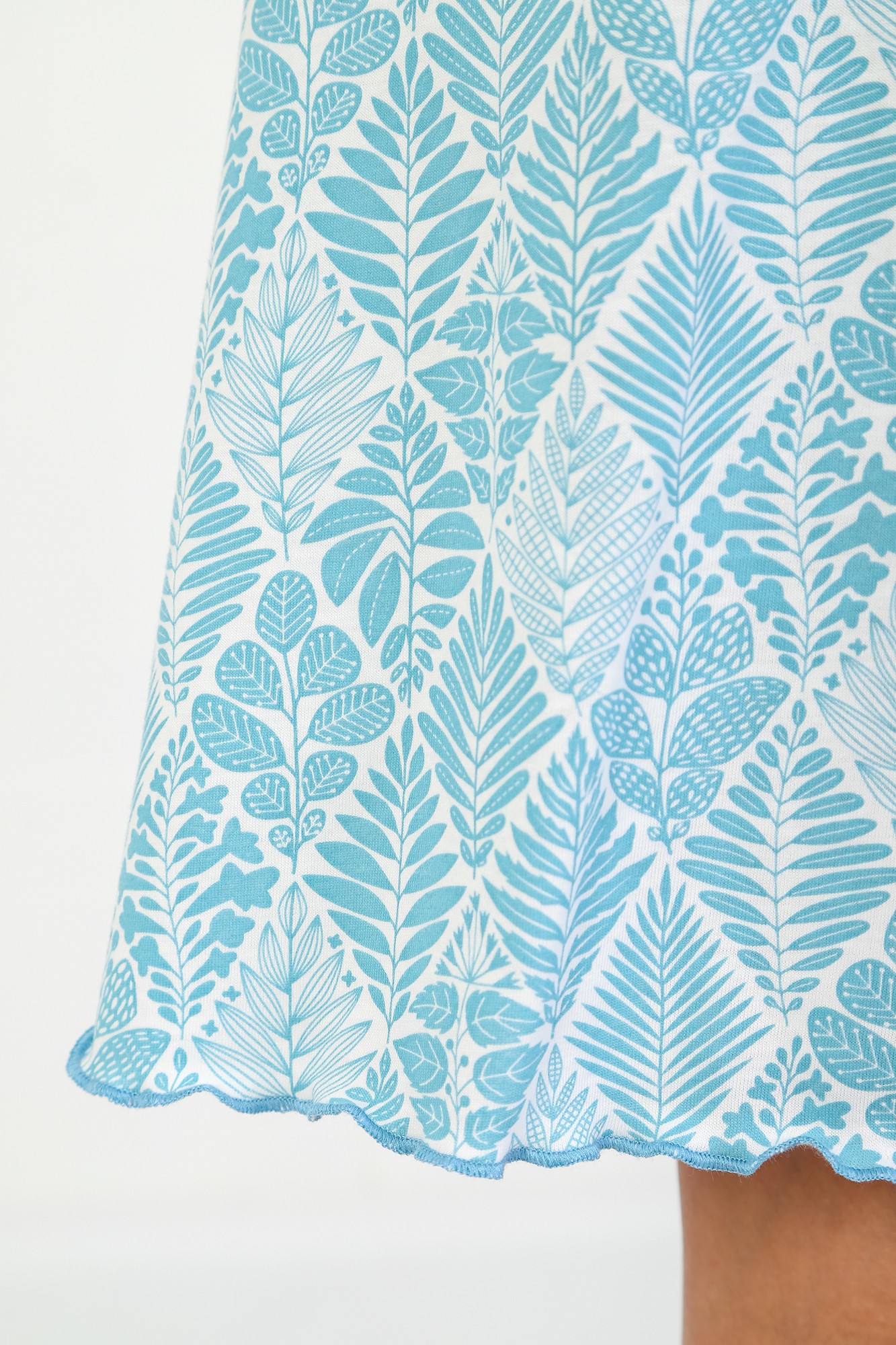 Сорочка женская из трикотажного полотна «кулирка» с набивным рисунком, расширенная книзу, без рукавов, с расширенной, углубленной горловиной овальной формы и притачной кокеткой по переду. Срезы пройм и горловины, а также шов притачивания кокетки, обработаны фасонной эластичной тесьмой с кружевным краем. Низ изделия обработан узкой обметочной строчкой.