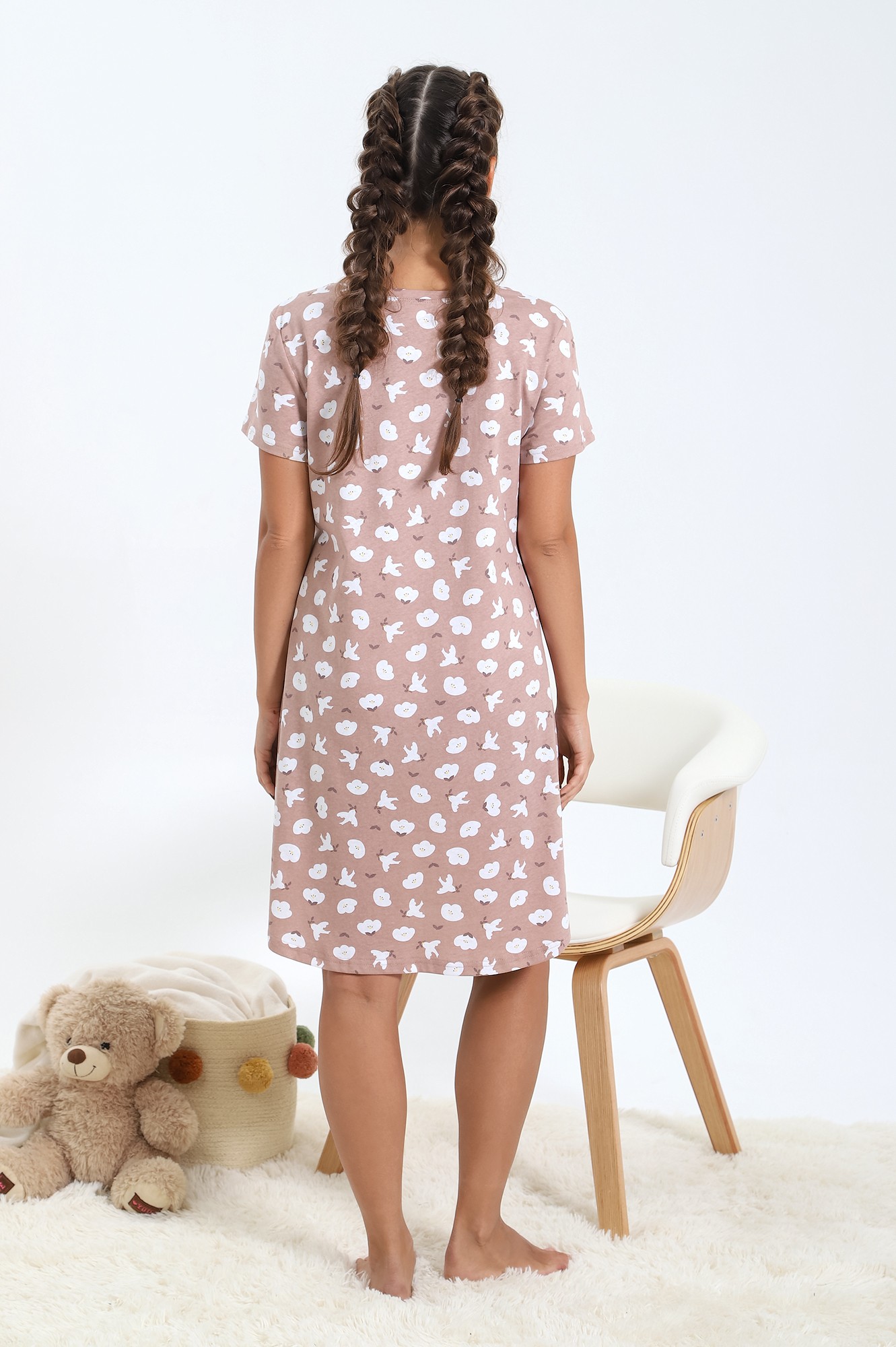 Сорочка женская из гладкокрашенного трикотажного полотна "кулирка" слегка расширенная книзу, с короткими втачными рукавами и горловиной овальной формы, обработанной притачной бейкой и фигурной линией низа. Перед - с отрезной кокеткой с разрезом по центру, обработанным притачными узкими планками и скрепленными между собой тремя пуговицами.