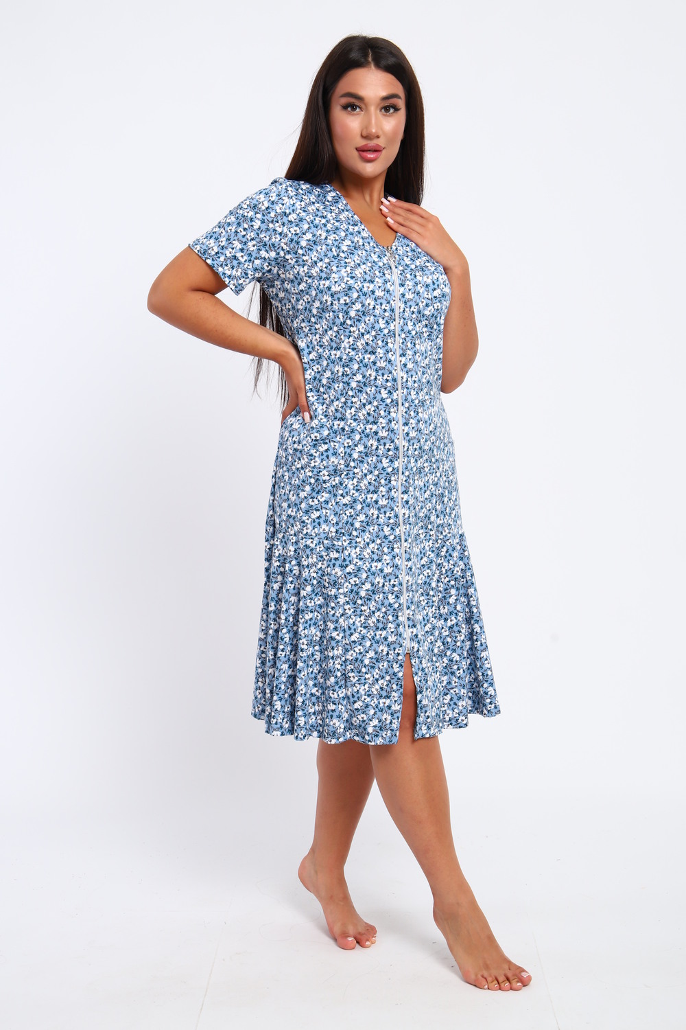 Халат женский с коротким рукавом на молнии выполнен из кулирки 100% хлопок. Горловина обработана узким кантом из основной ткани, по бокам карманы, внизу расклешение. Халат идеально подойдет для дома и отдыха. Цвет: голубой; Материал: кулирка;кулирка; Состав: хлопок 100%.