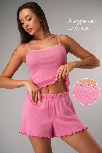 Женский комплект из майки с шортами в розовом цвете — отличный выбор для сна или отдыха. Хлопковая пижама для женщин смотрится особенно уютно и аккуратно, подчёркивая настроение домашней свободы и расслабленности.
