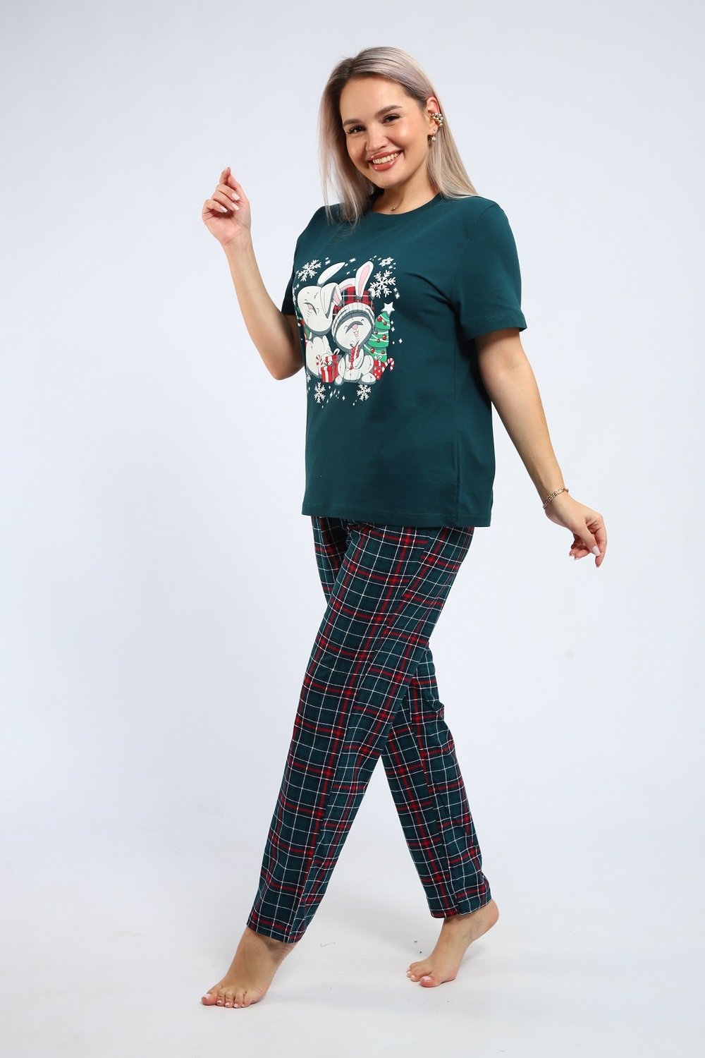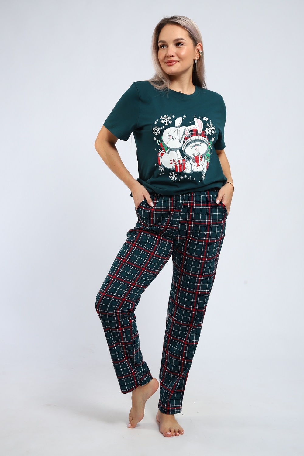 Уютная комфортная пижама из футболки с милым принтом Зайки и брюками в клетку с двумя карманами. Цвет: зеленый;красный; Материал: кулирка;кулирка; Состав: хлопок 100%.