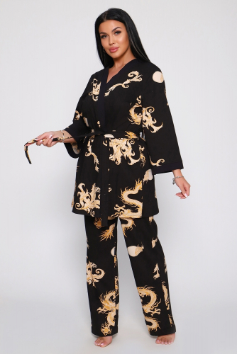 Элементы: Включает три предмета: топ на бретелях с кружевной отделкой, свободные брюки и халат с рукавом 3/4.