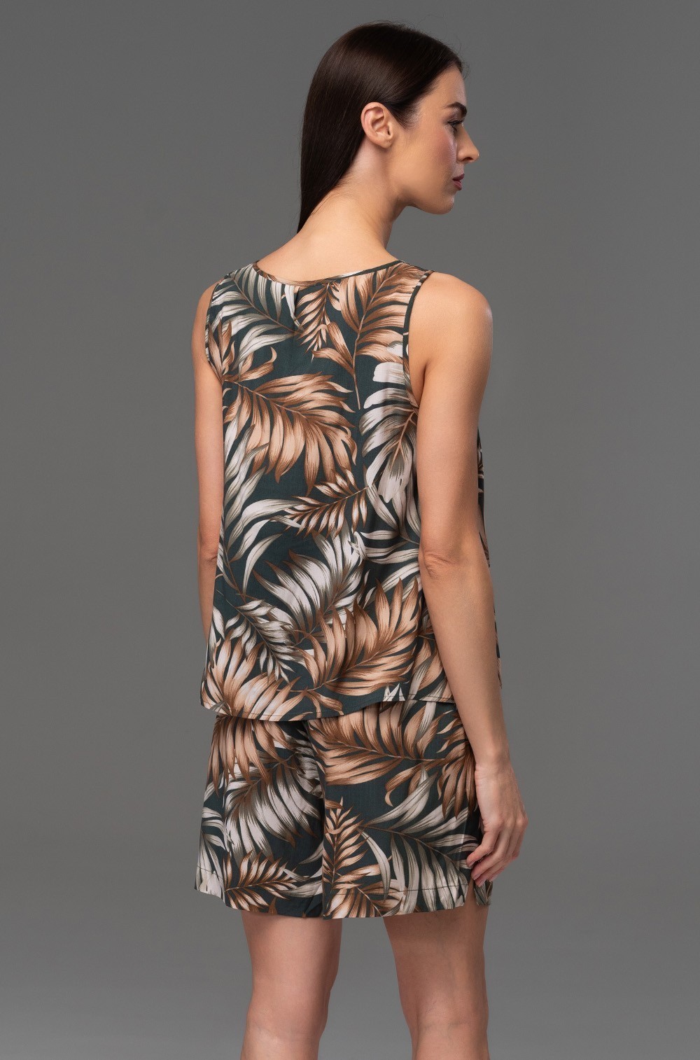 Комплект Mia-Amore состоит из топа маечного типа и шорт, выполнен из принтованной вискозы. Верх топа декорирован кокосовыми пуговицами. По бокам шорт обработаны карманы.