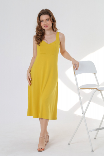 Сарафан из трикотажного полотна «кулирка» в сочетании двух видов в единой цветовой гамме: с мелкоузорчатым набивным рисунком, имитирующим ткацкое переплетение «рогожка» и с рисунком в мелкую клетку, отрезной по линии талии, с V-образной горловиной, центральной бортовой застежкой на обметанные петли и пуговицы и вышивкой на левой полочке лифа. Горловина спинки и проймы окантованы основным материалом. Юбка присборена по шву соединения с лифом. Съемный завязывающийся пояс фиксируется двумя шлевками из окантовки, вставленными в боковые швы на уровне талии.