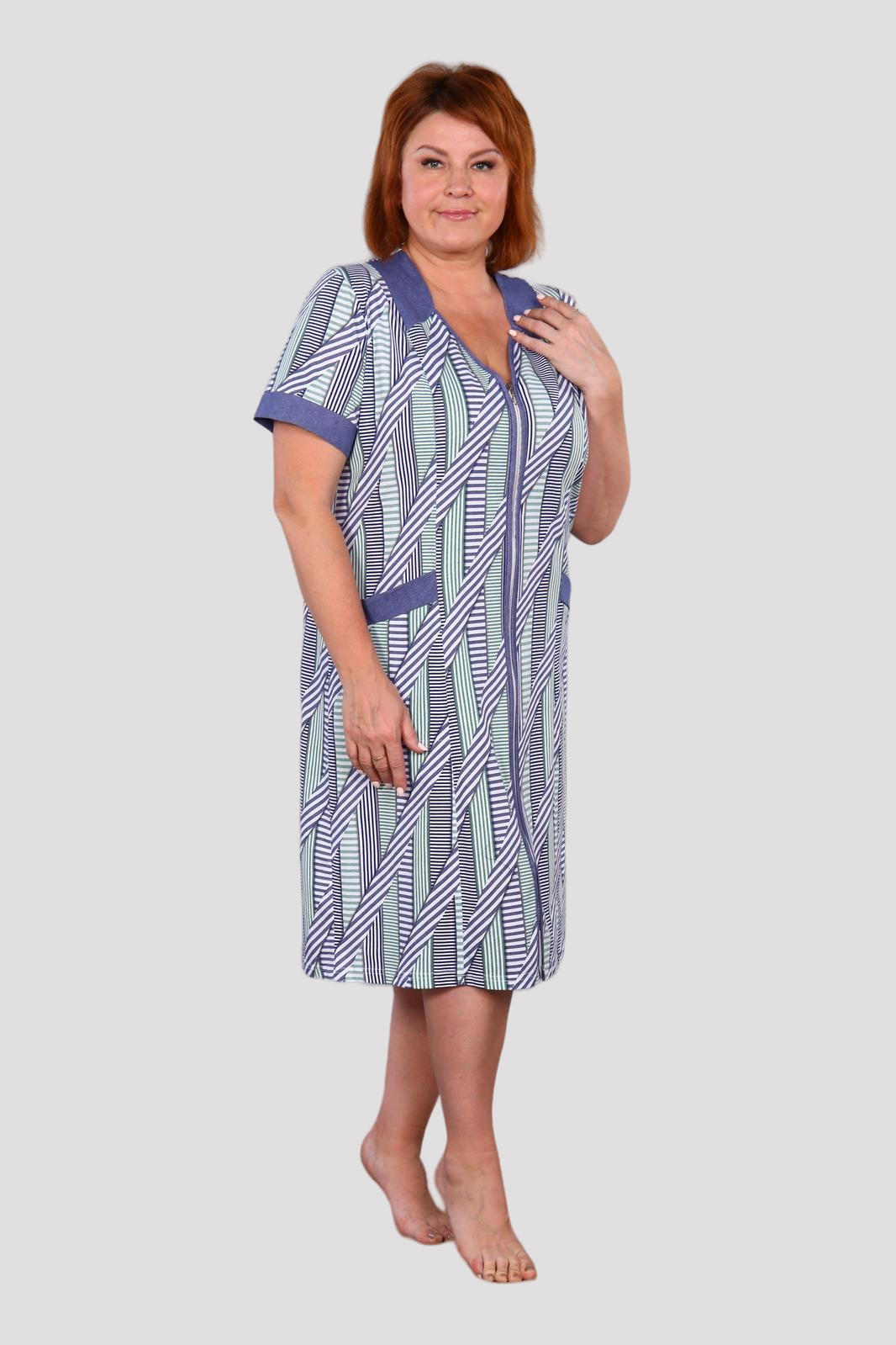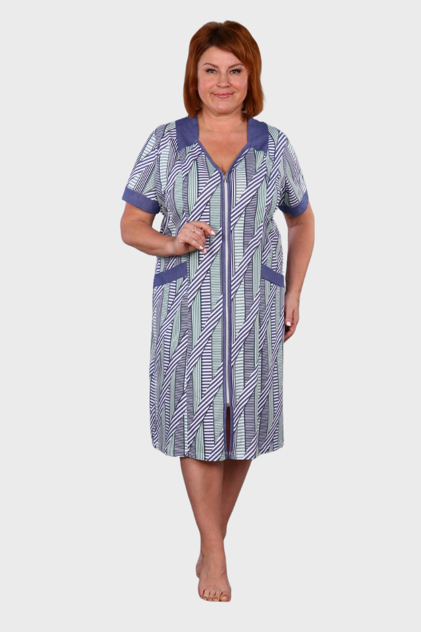 Женский халат полуприлегающего силуэта на молнии. Полочка и спинка с рельефами. На полочке оригинальная кокетка из отделочной ткани, имитирующая воротник. Планки на карманах и манжеты на рукавах также выполнены из отделочной ткани. Рукав втачной.