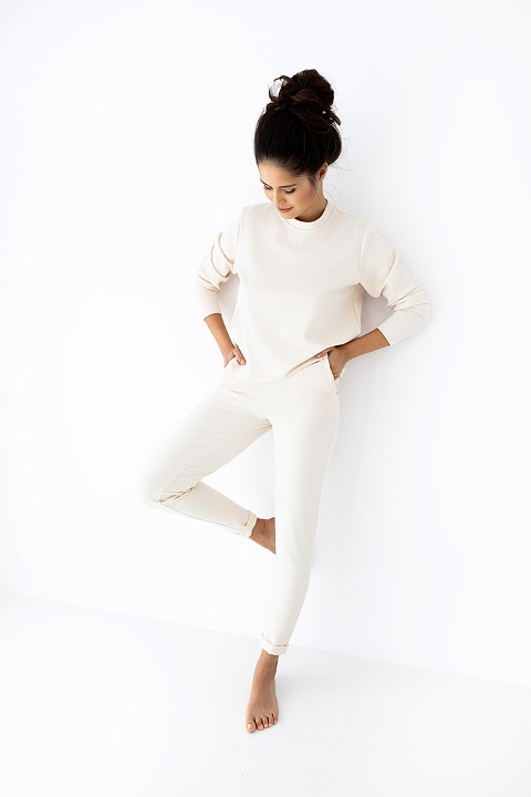 Повседневная однотонный костюм Latika состоит из лонгслива и брюк. Лонгслив прямого кроя, с круглым вырезом горловины. Брючки зауженные, с карманами. Идеальный вариант не только для сна, но и для домашнего отдыха.