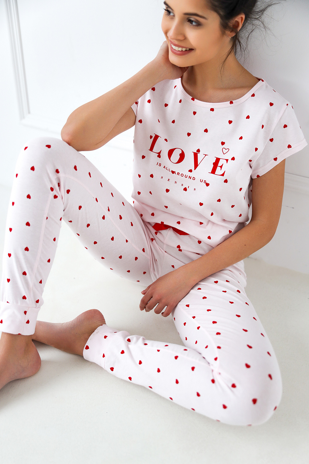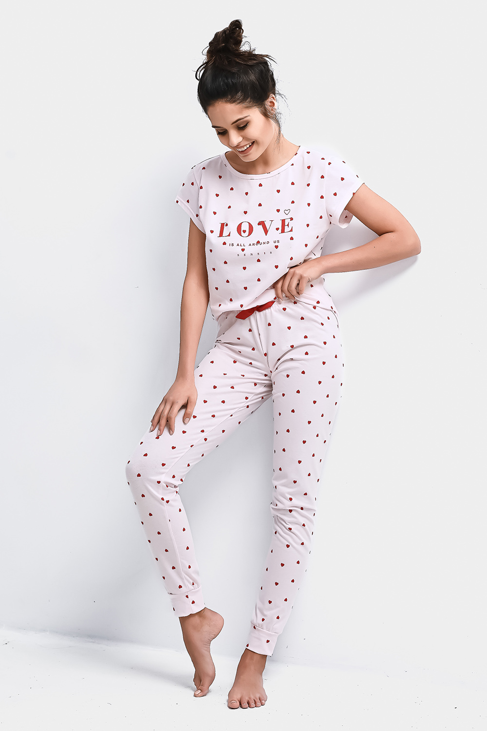 Хлопковая пижама Aura состоит из футболки с надписью на груди и зауженных брюк с принтом "сердечки". Элемент декора-бантик.