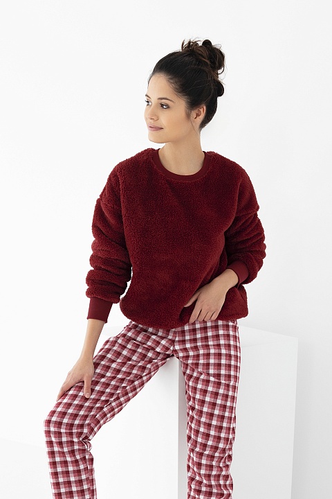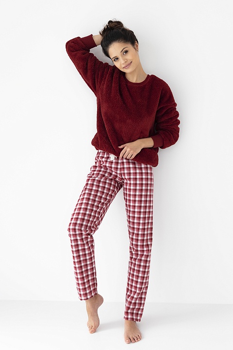Уютная пижама Bessie состоит из свитшота свободного кроя и брюк в клетку. Свитшот из очень мягкого материала. Брюки прямые, декорированы бантиком на поясе и на широкой резинке. Состав брюк: хлопок 100%. Идеальный вариант не только для сна, но и для домашнего отдыха.