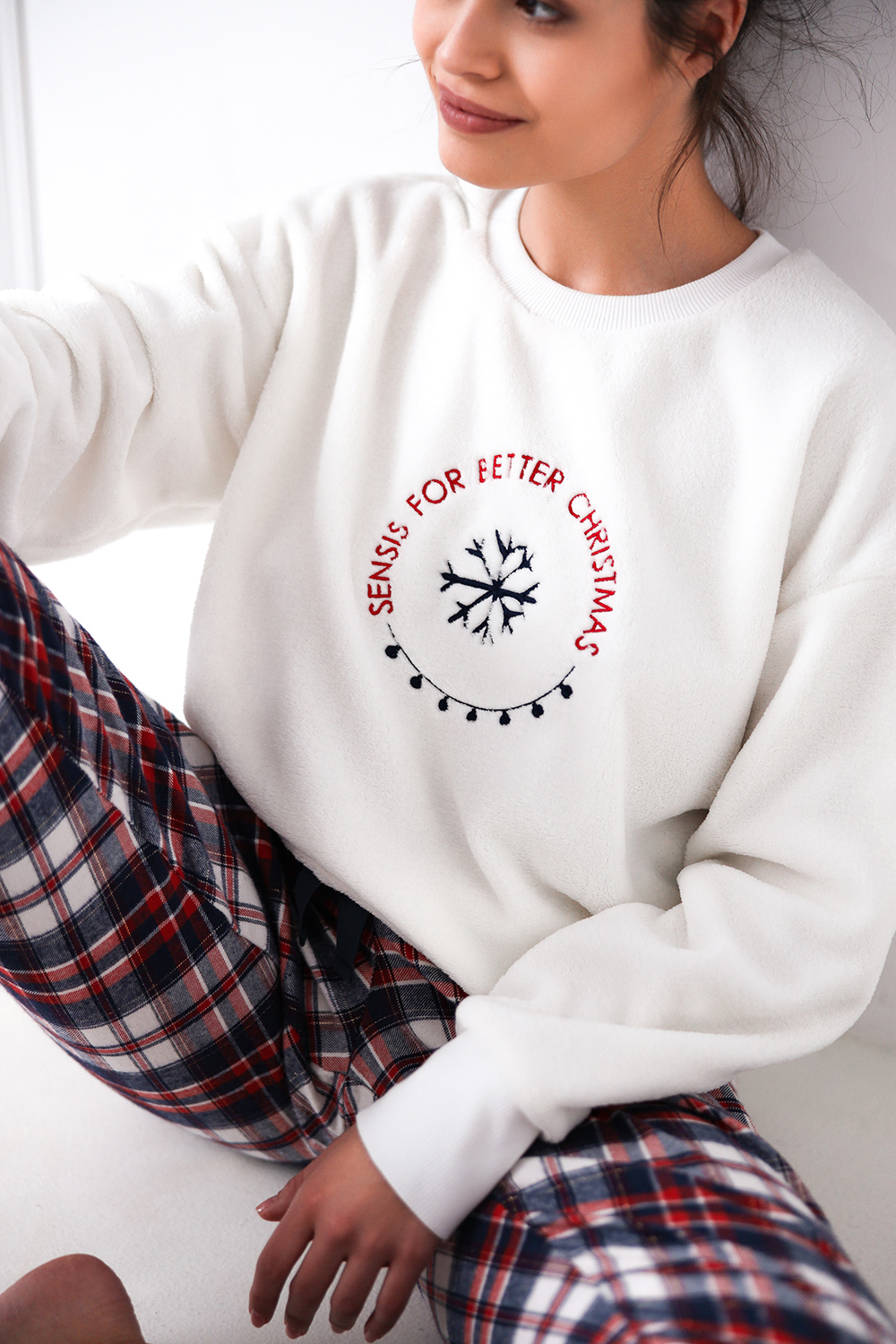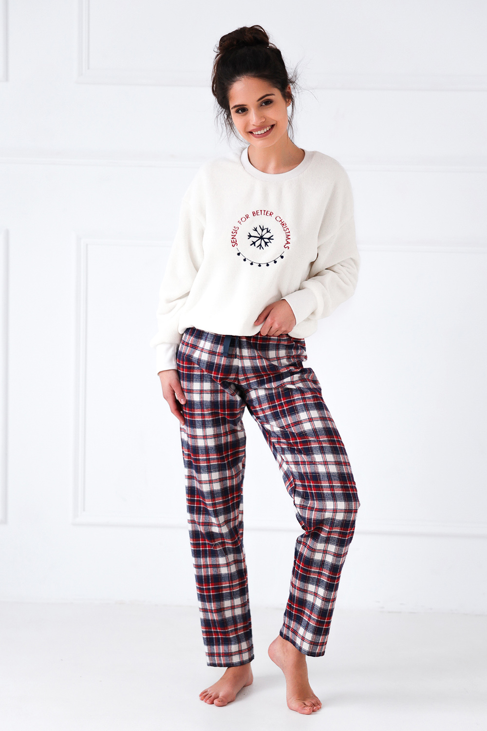 Пижама Better состоит из очень мягкой толстовки белого цвета с надписью на груди и фланелевых брюк в клетку прямого кроя. На рукавах толстовки плотные резинки. В составе брюк: 60% хлопок, 39% полиэстер и 1% люрекс.