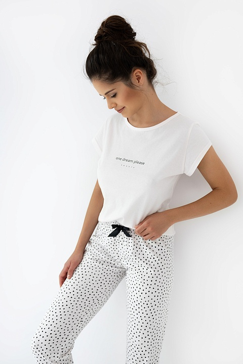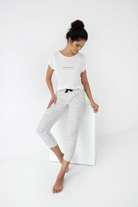 Пижама Christabel состоит из футболки и брюк. Футболка приталенная, с круглым вырезом горловины и с забавной надписью на груди. Брючки зауженные, укороченные. Идеальный вариант не только для сна, но и для домашнего отдыха.