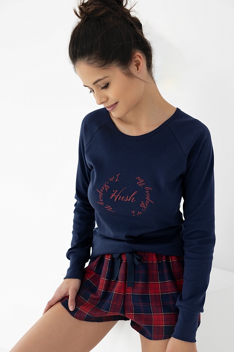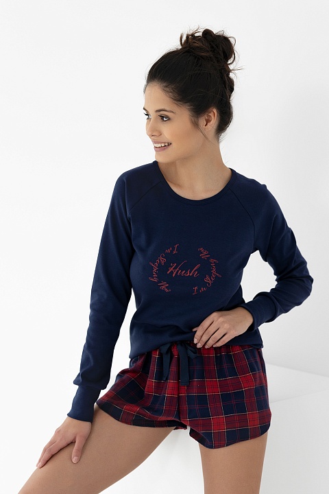 Хлопковая пижама Adelaide состоит из лонгслива по силуэту и шорт в крупную клетку. Лонгслив с круглым вырезом горловины и надписью на груди. Шорты свободные, на широкой резинке. Состав шорт: хлопок 63%, полиэстер 35%, модал 2%. Идеальный вариант не только для сна, но и для домашнего отдыха.