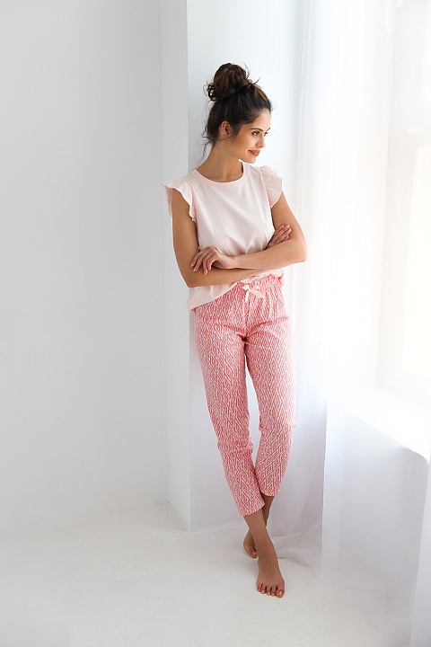 Пижама Elena с укороченными брюками и футболкой. Футболка с круглым вырезом горловины и рукавами-воланами. Брюки заужены к низу и декорированы геометрическим принтом и миниатюрным бантиком.