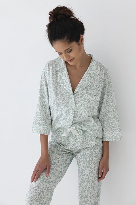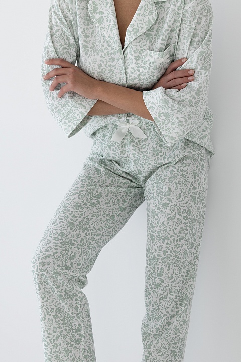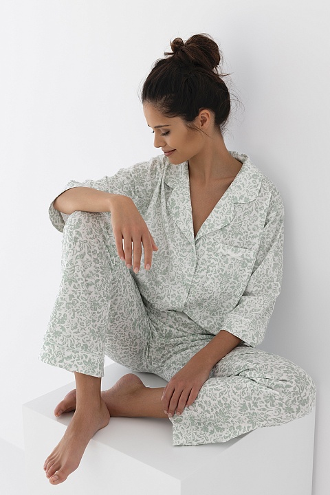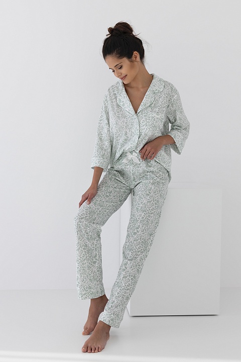 Необычная пижама Elise состоит из принтованных рубашки и брюк. Рубашка свободного силуэта. Брюки прямого кроя, на широкой резинке. Идеальный вариант не только для сна, но и для домашнего отдыха.