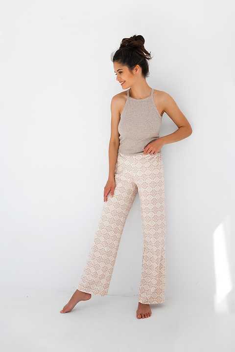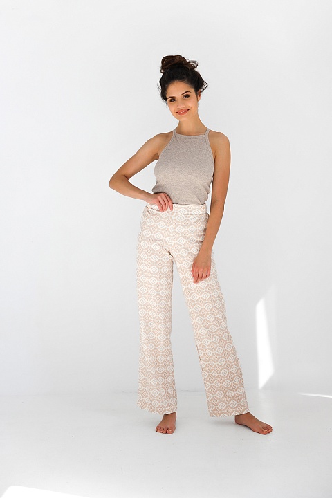 Пижама Francesca с топом "в рубчик" и брюками. Брюки свободного кроя с интересным геометрическим принтом. Подобный вариант пижамы идеально подойдет для теплого времени года. Состав брюк: хлопок 100%.
