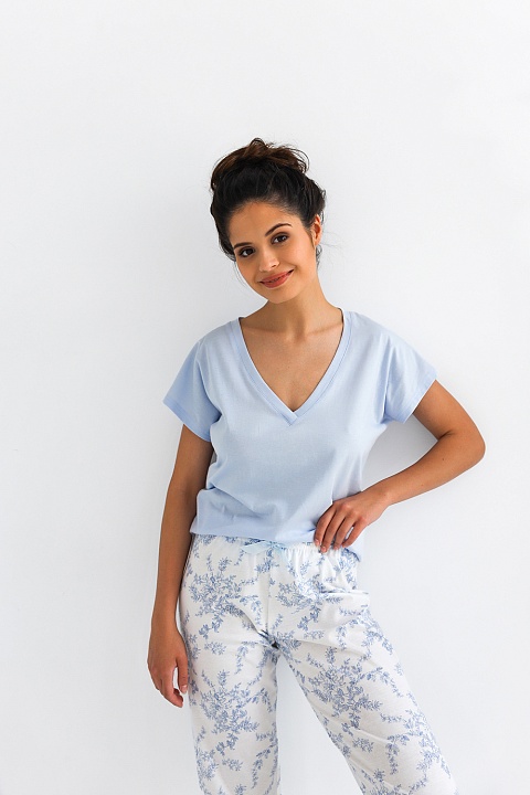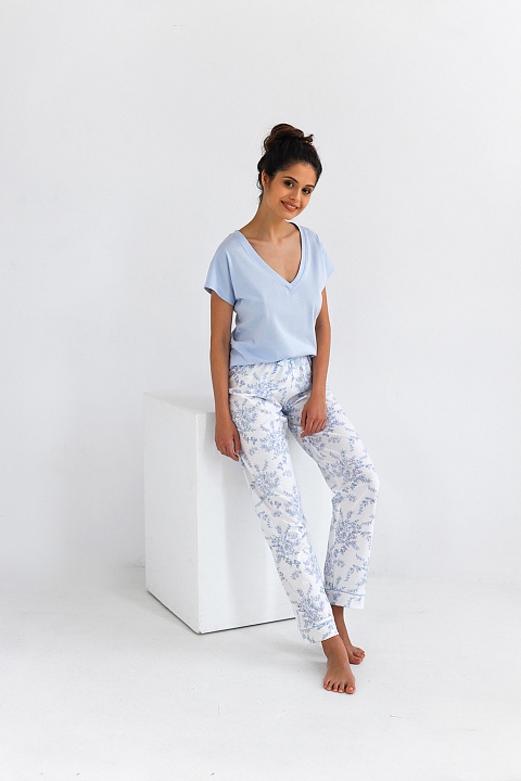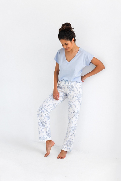 Пижама Gabrielle с футболкой и брюками. Футболка с глубоким v-образным вырезом горловины свободного кроя. Брюки прямого кроя с оригинальным растительным принтом. Декорированы атласным бантиком. Пижама идеально подойдет для сна и отдыха дома.