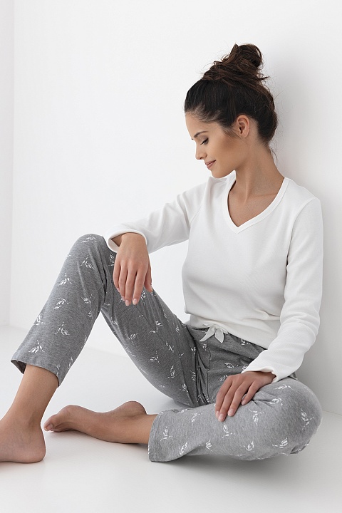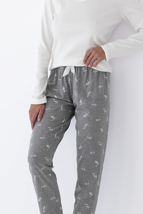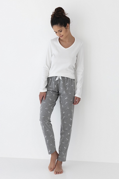 Пижама Hattie состоит из однотонного лонгслива и принтованных брюк. Лонгслив по силуэту с длинными рукавами. Брюки прямого кроя на широкой резинке. Состав брюк: хлопок 80%, полиэстер 20%. Идеальный вариант не только для сна, но и для домашнего отдыха.