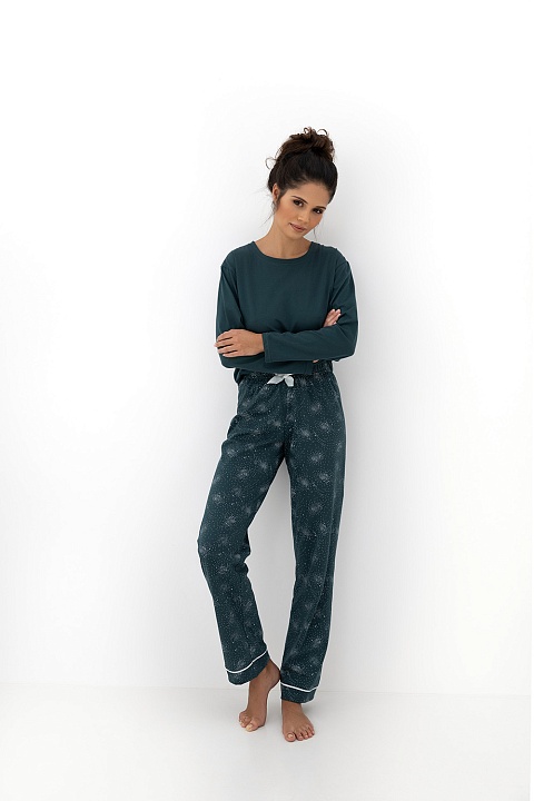 Повседневная пижама June темно-синего цвета состоит из однотонного лонгслива и принтованных прямых брюк. Вырез горловины круглый. Идеальный вариант не только для сна, но и для домашнего отдыха.