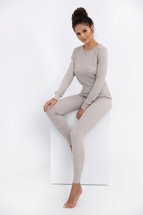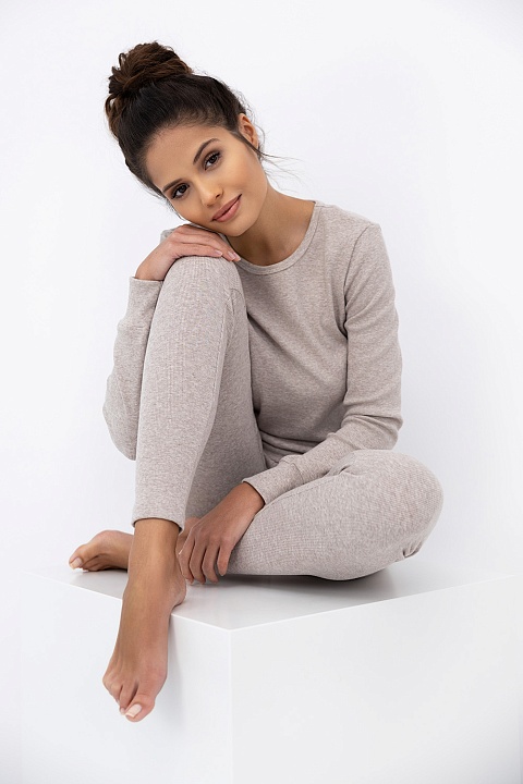 Повседневная пижама Mabel состоит из зауженных брюк и однотонного лонгслива "в рубчик". Брюки на широкой резинке. Рукава оформлены манжетами. Идеальный вариант не только для сна, но и для домашнего отдыха.