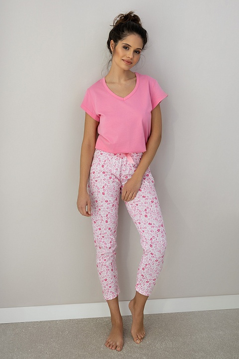 Яркая пижама Nevaeh состоит из футболки и брюк. Футболка однотонная, с v-образным вырезом. Брючки укороченные, зауженные с цветочным принтом. Идеальный вариант не только для сна, но и для домашнего отдыха.