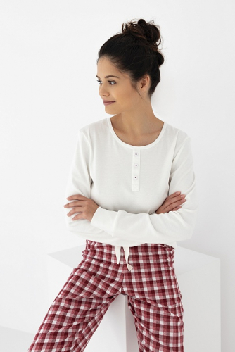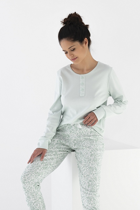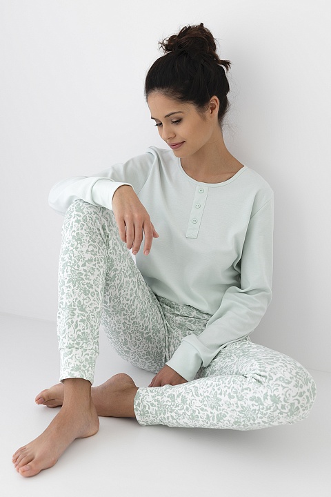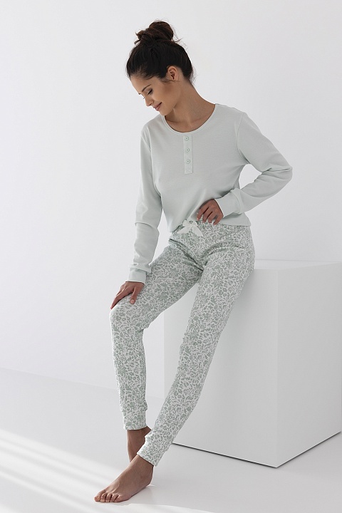 Пижама Olive состоит из лонгслива и брюк. Лонгслив с круглым вырезом горловины. Брюки облегающие с принтом. Идеальный вариант не только для сна, но и для домашнего отдыха.