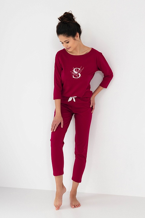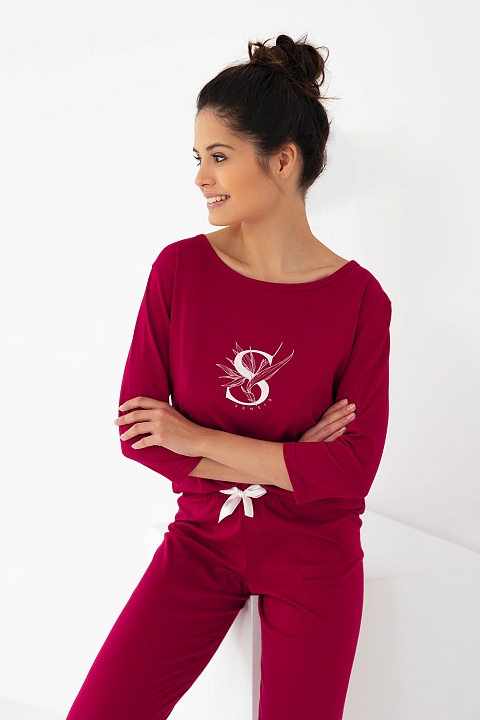 Пижама Sarah состоит из свитшота и брюк. Свитшот по силуэту с рукавами 3/4. Брюки зауженные на широкой резинке. Идеальный вариант не только для сна, но и для домашнего отдыха.