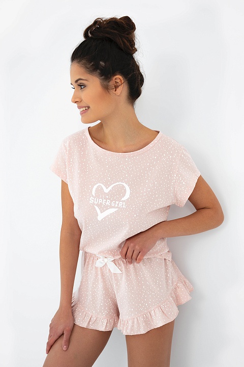 Хлопковая пижама Super Girl состоит из футболки свободного кроя и шорт. Футболка с круглым вырезом горловины. Шорты свободные, на широкой резинке. Идеальный вариант не только для сна, но и для домашнего отдыха.