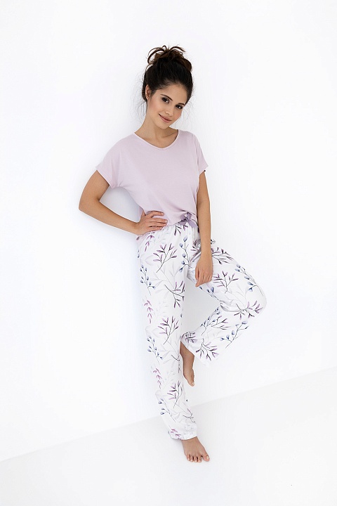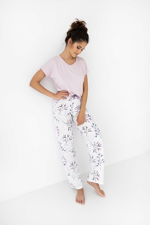 Пижама Suzelle состоит из футболки и прямых брюк. Футболка с v-образным вырезом горловины. Брюки с цветочным принтом и на широкой резинке. Идеальный вариант не только для сна, но и для домашнего отдыха. Брюки: хлопок 100%